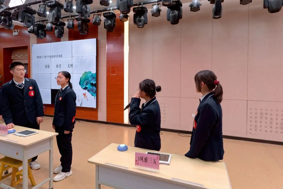 赛场之上,同学们同台竞逐、各展才情。大家以诗会友,汉字书写凝神落笔,诗词对答酣畅利落,朗朗吟诵藏书香,从容应答显积淀,书生意气自芳华。穿插其间的学生表演,更是频频赢得全场欢呼。