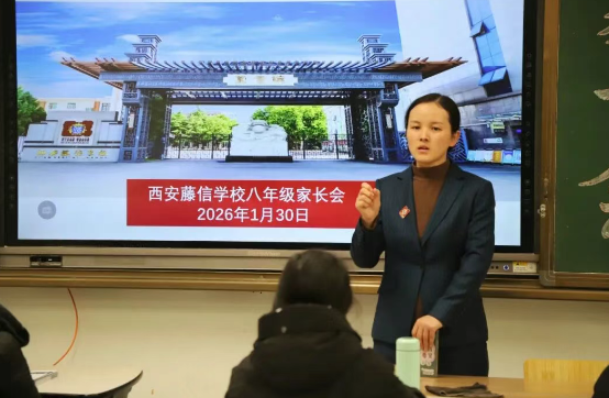 西安藤信学校常务副校长、初中部校长肖雁围绕学校 “民族脊梁、世界精英” 的办学目标展开分享。她讲到,在世界发展日新月异、变革加速推进的当下,学校始终主动适应时代变化、紧跟发展潮流,深耕核心素养育人实践,结合智慧课堂推进自主学习,倾力培养契合时代需求的精英。同时还分享了个人对教育的深层思考,强调育人过程中要注重培养学生的科学素养,引导家长和学生从科学视角认知世界、探索未知。最后肖校长向全体家长与学生送上寒假期许,并致以新春的美好祝福。