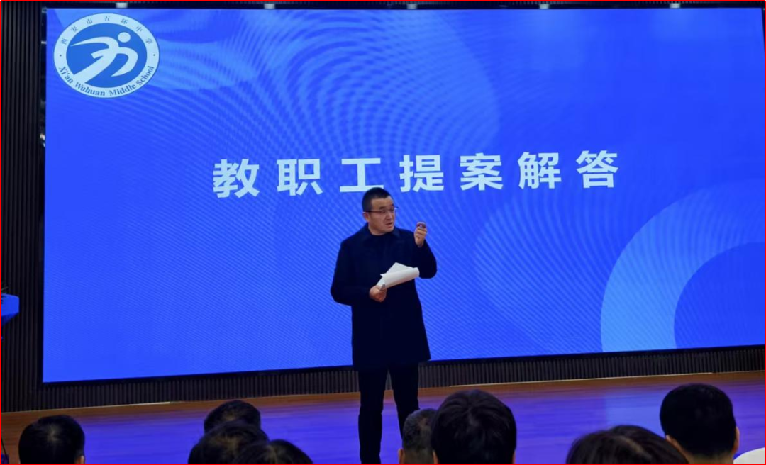 学校党总支书记郑红科同志代表学校,对会前通过民主渠道广泛征集到的各年级、各部室及部分教师的提案进行了逐项、细致的解答。回应涵盖了教师专业成长、福利待遇、身心健康、教育教学发展等广大教职工高度关注的领域,给出了清晰明确的解决方案和未来规划,充分体现了学校对教职工心声的高度重视和务实态度。