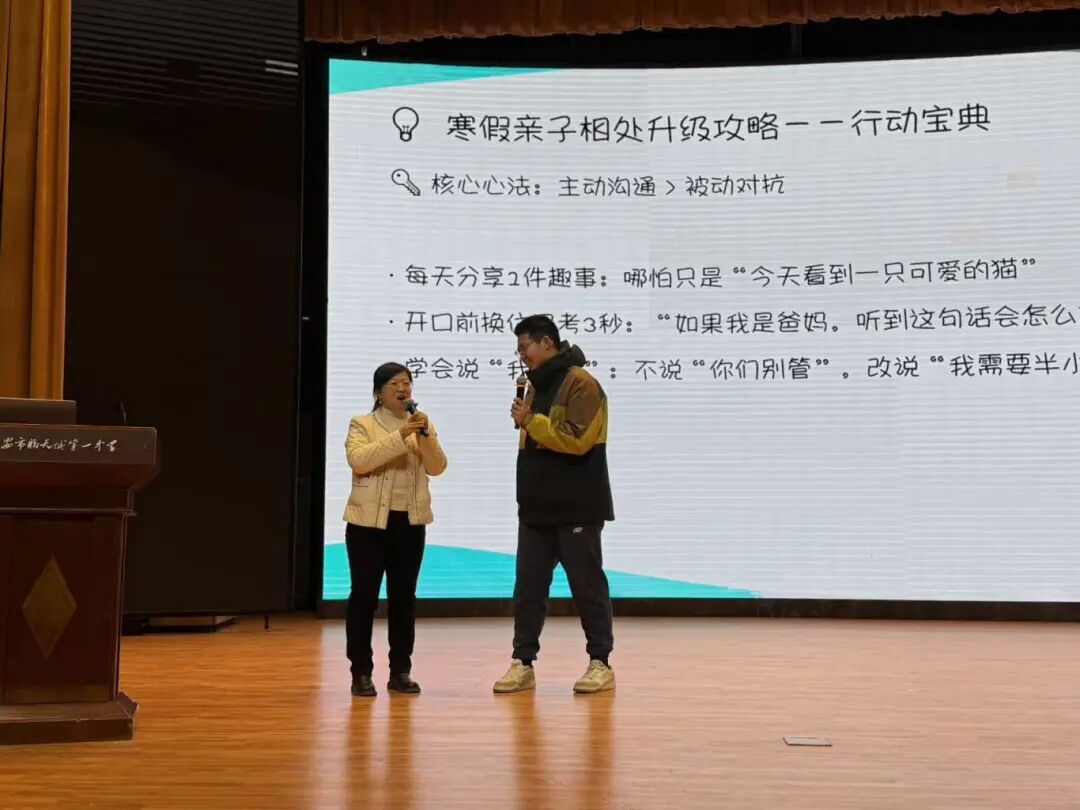 与父母的相处呢?两位专家通过现场角色互换模拟演练如何与父母好好说话,鼓励同学们通过主动沟通、共同计划、家务参与、冲突化解等方式,将寒假变为增进理解、促进合作的契机。