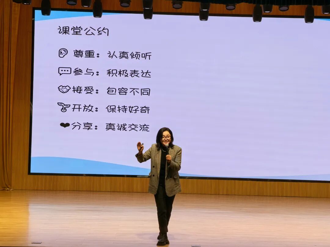 讲座在温暖而充满力量的仪式中步入尾声。在专家的引导下,全体同学将右手放在心口,对自己轻声说出感谢,呼气释放压力,吸气拥抱平静。