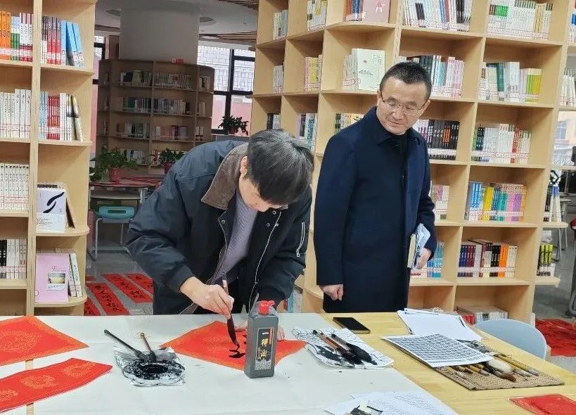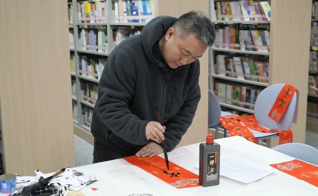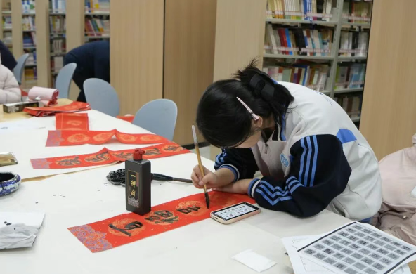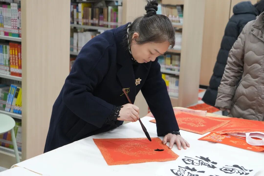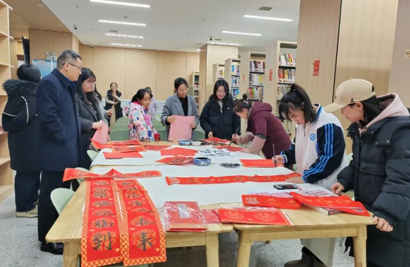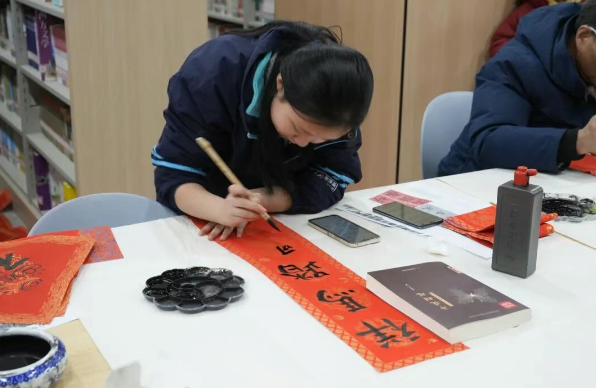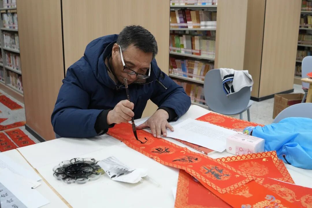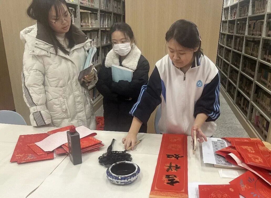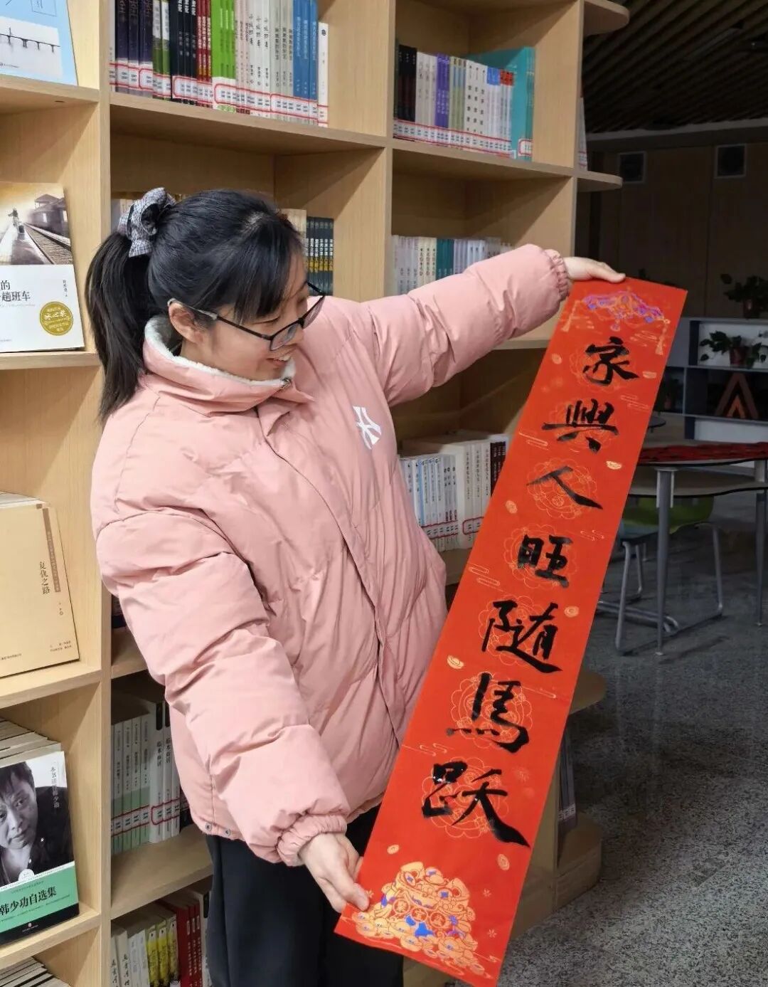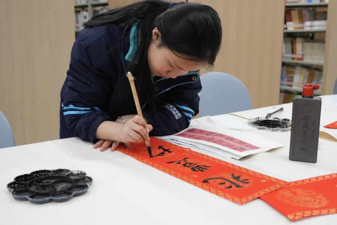 活动当天,图书馆俨然成了一片喜庆的红色海洋。艺术中心的老师们与书法特长的学子们凝神静气,挥毫泼墨。笔锋流转间,一幅幅满载吉祥寓意的春联跃然纸上:“春风化雨润桃李,丹心育苗绽芳华”“门迎百福福星照,户纳千祥祥云开”……既有对教育事业的深情寄托,也有对美好生活的热切向往。