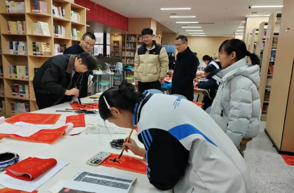 岁末寒冬,笔墨生暖。2025年1月29日,西安市五环中学图书馆内纸墨飘香、笑语盈盈,一年一度的“迎新春·写春联”传统文化活动在这里温暖举行。校工会联合艺术中心,组织书法特长师生现场挥毫,为全校教职工送上了一份充满文化韵味与深情祝福的新年礼物。