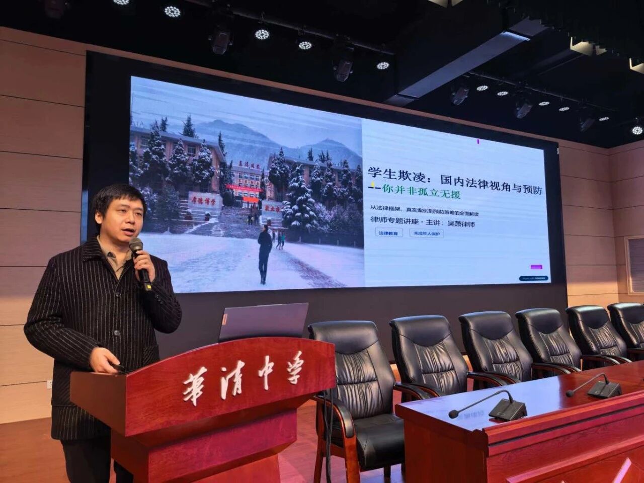 华清中学2005届校友、上海市数据安全委员会委员、拥有未成年人心理健康领域工作经验的吴萧律师,带来《学生欺凌:国内法律视角与预防》专题讲座。吴律师从学生欺凌的法律定义、四大核心特征与身体、言语、网络、关系四类常见类型切入,结合国内中学生欺凌相关调研数据,让同学们清晰认识到欺凌的危害。他系统解读了《中华人民共和国未成年人保护法》《中华人民共和国预防未成年人犯罪法》等反欺凌相关法律法规与政府指导意见,深度剖析了江油事件、邯郸活埋案、中关村二小案等五个典型案例,明确了学生欺凌的民事、行政、刑事三层法律后果,以及学校、家长、相关部门的各方责任。同时,吴律师从学校、家庭、个人三个层面给出具体的预防与应对策略,教会同学们遭遇欺凌时要保存证据、勇敢求助,旁观者要拒绝沉默、安全干预,引导同学们用法律武器守护自身权益,共建安全和谐的校园环境。