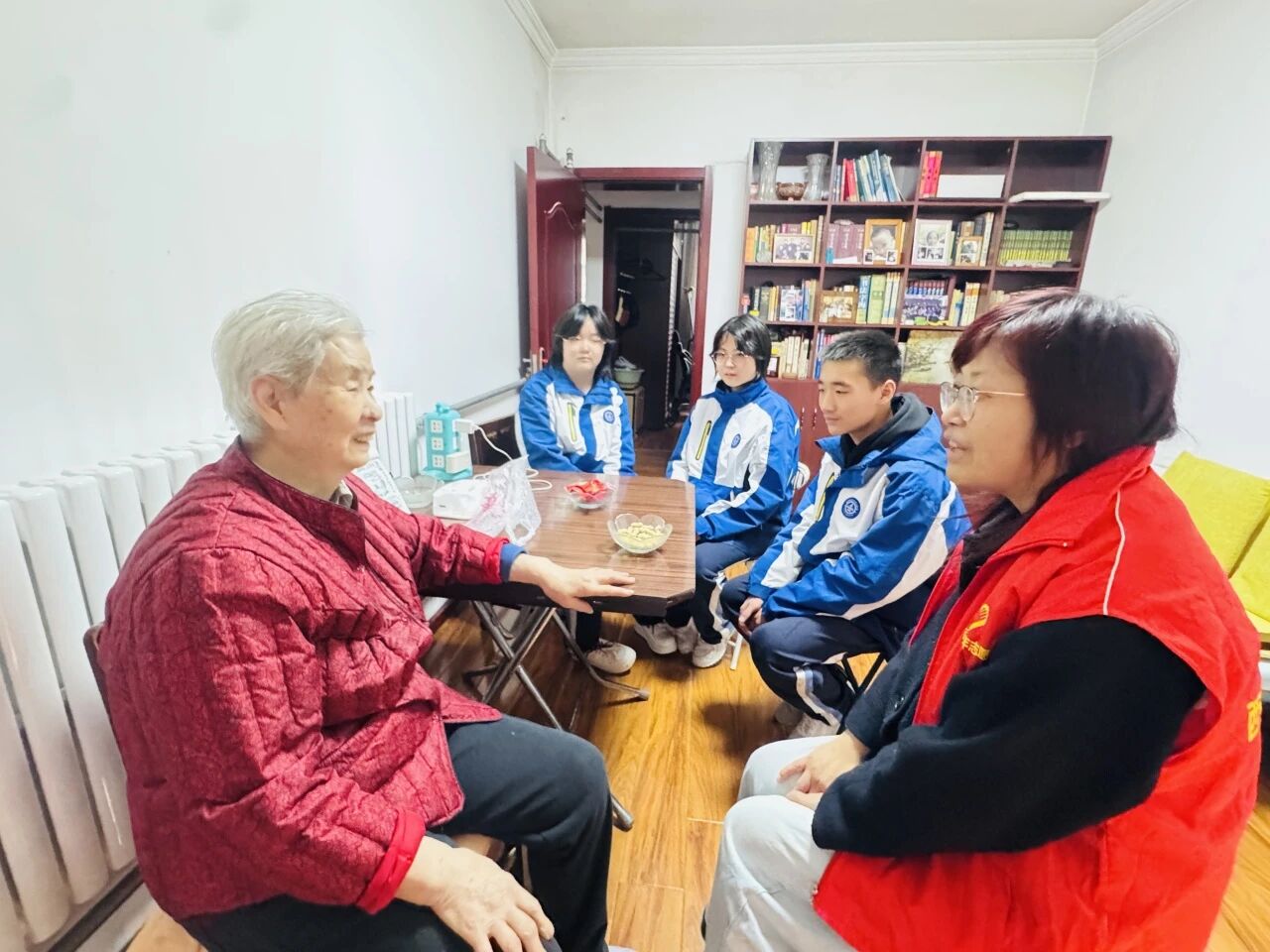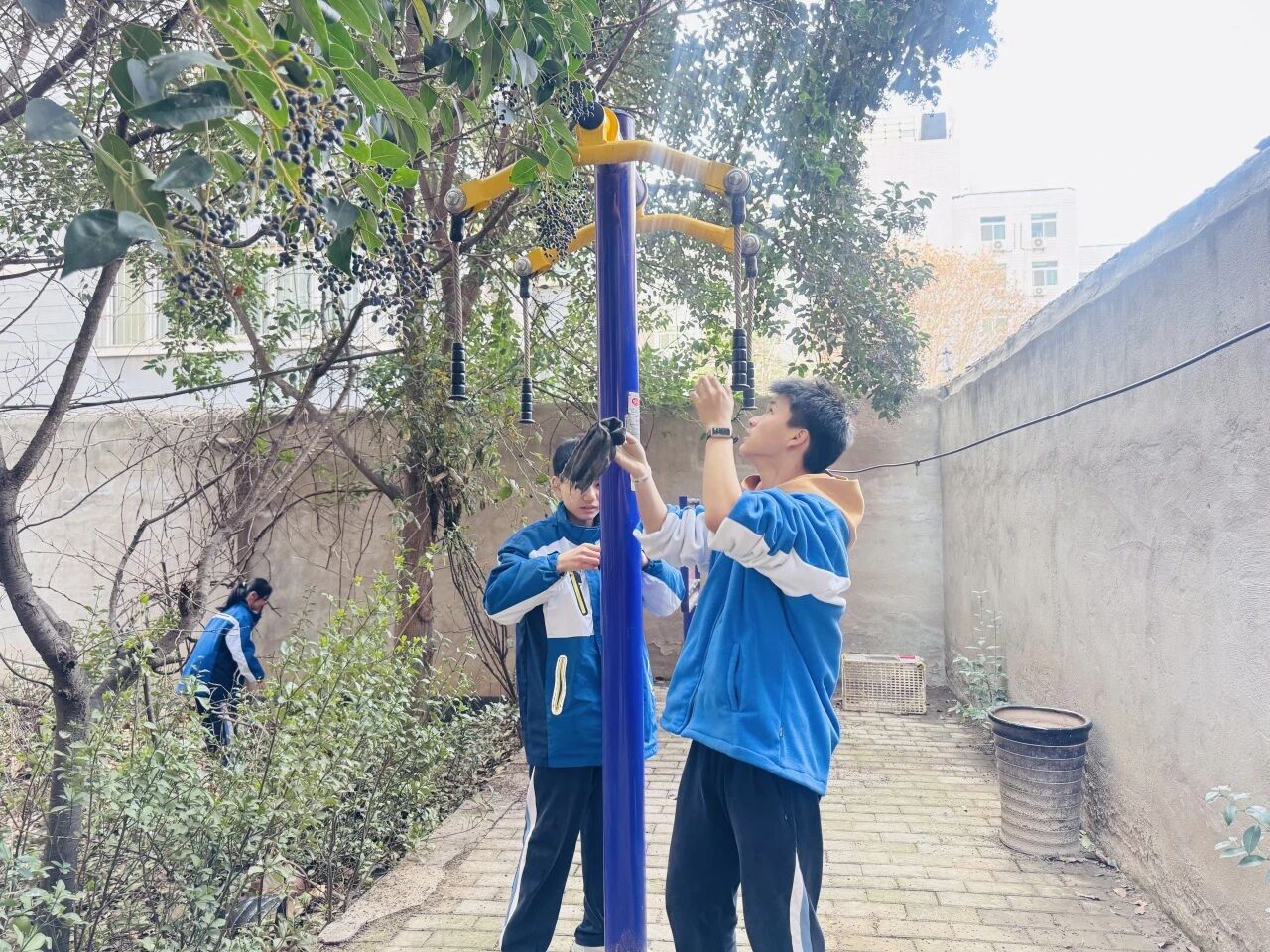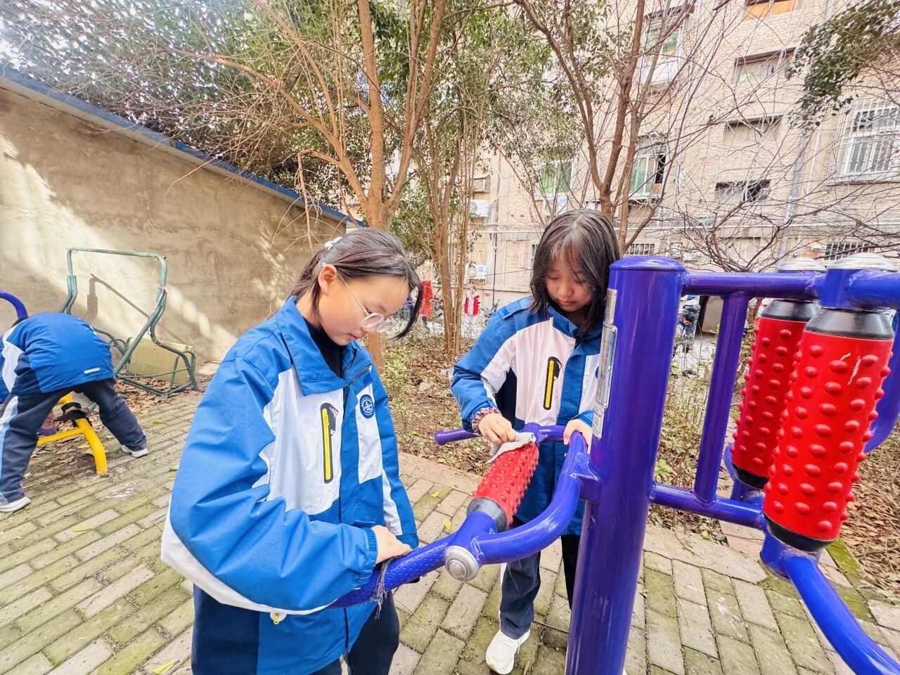 学校积极推进学社联动,与测绘局社区携手共建,组织志愿者走进电子公司家属院。志愿者们认真清扫小区楼道、清理环境卫生、擦拭健身器材与公共座椅,让老旧小区焕然一新;随后赵一聪副主任带着志愿者们分组入户,为社区老人送上关怀,陪老人谈心聊天、帮助整理家务,用陪伴与关爱温暖人心。在服务群众、敬老助老的过程中,深化感恩教育与为民情怀,让大思政课有温度、有力量、有实效。