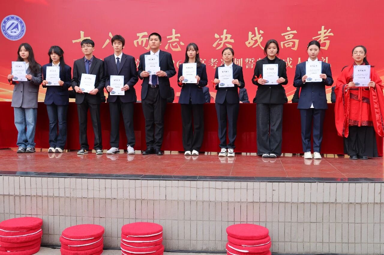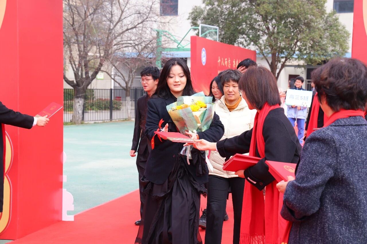 授旗仪式上,战旗猎猎,那是责任的传递,更是荣光的延续。校领导郑重地将一面面象征着胜利与希望的战旗,授予高三各班班主任。班主们任紧握战旗,挥舞之间,红旗如火焰般在风中翻涌。这一刻,旗帜的交接,不仅是信任的托付,更是军令状的签订;它承载着学校对学子们的殷切期盼,也凝聚着全体高三师生决胜高考、誓创辉煌的磅礴力量。