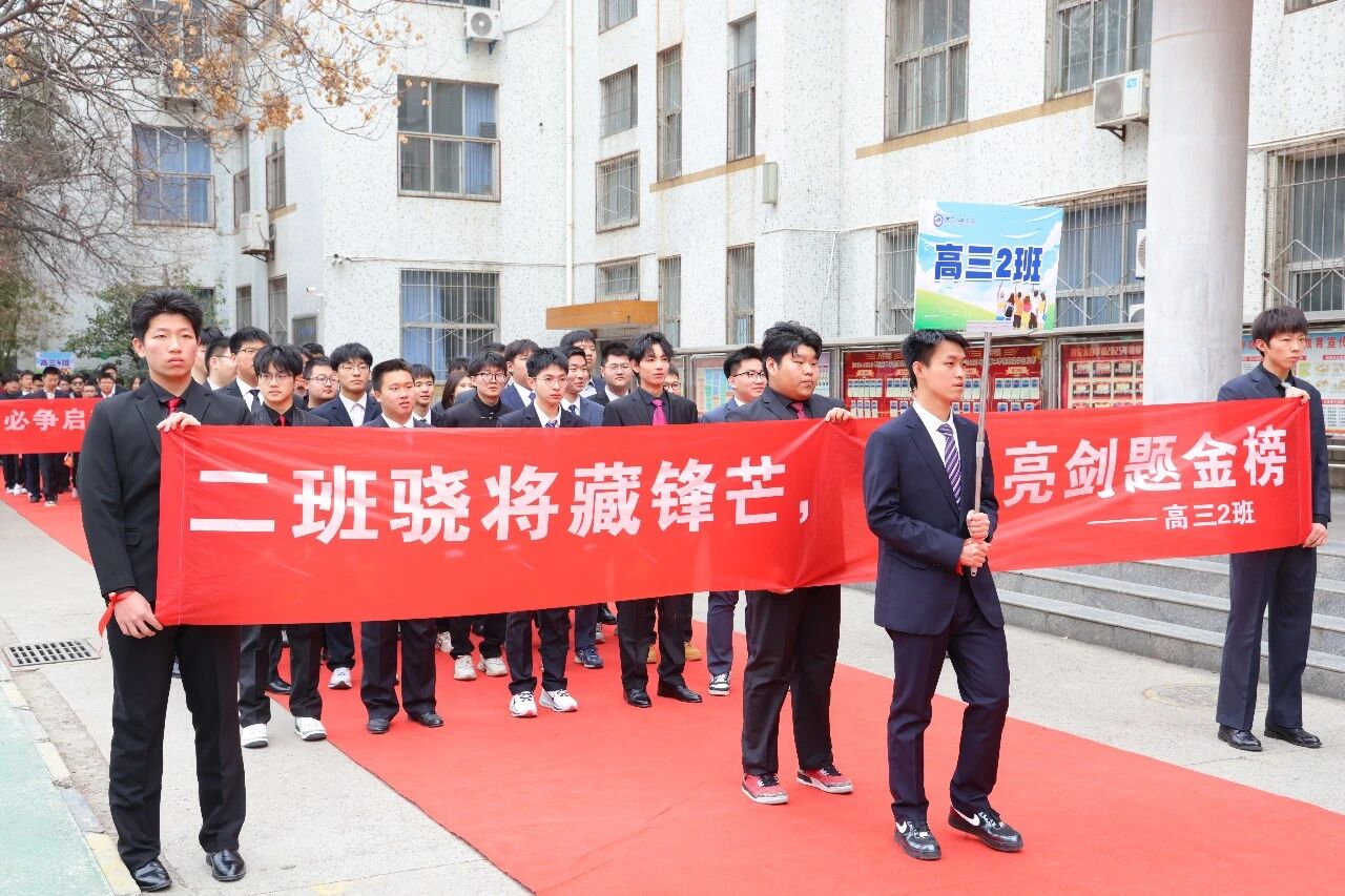 伴随着激昂的进行曲,高三学子方队迈着铿锵有力的步伐依次入场。他们目光如炬,步履铮铮,眼眸里藏着十八年求学路的点滴回忆——那些教室灯下的苦读、操场跑道的奔跑、同窗相伴的温暖,都化作此刻的从容与底气。十八岁的号角已经吹响,他们身披荣光,整装待发,只为在六月的苍穹下扶摇直上,金榜题名。
