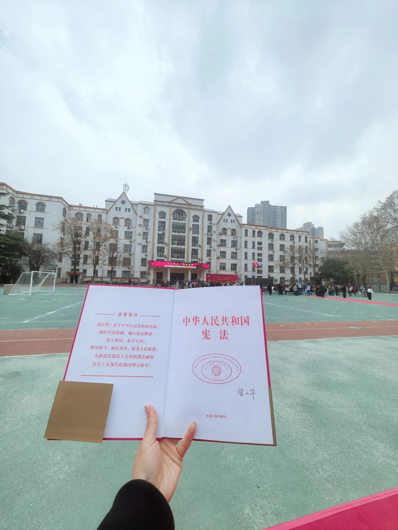 从校领导们手中接过宪法,这不仅是跨越成长的门槛,更是迈向责任与担当的崭新起点。那一刻,爱国、感恩、梦想、坚强,所有美好的情感在心中升腾。