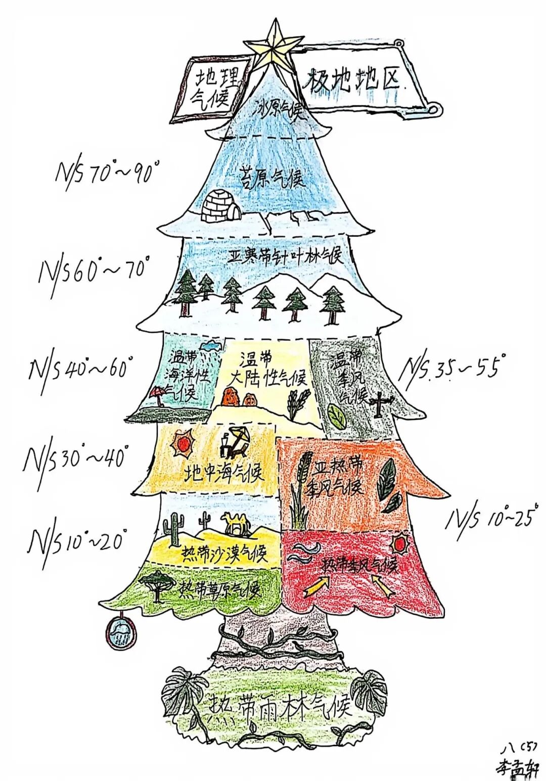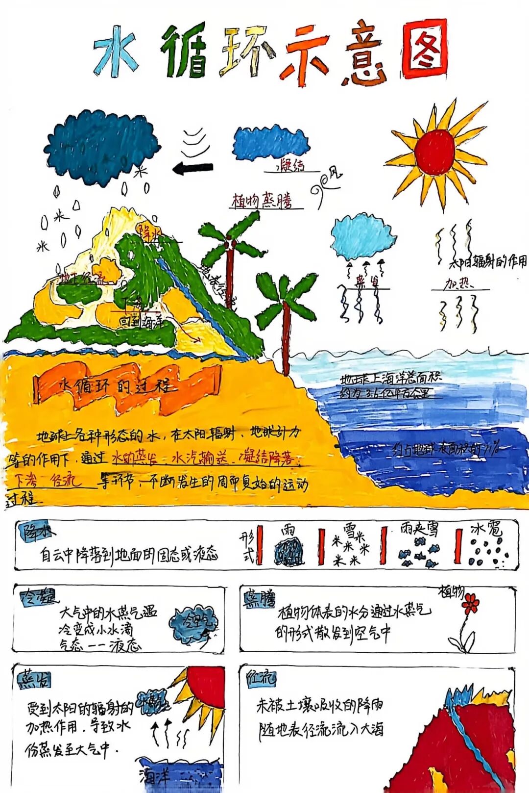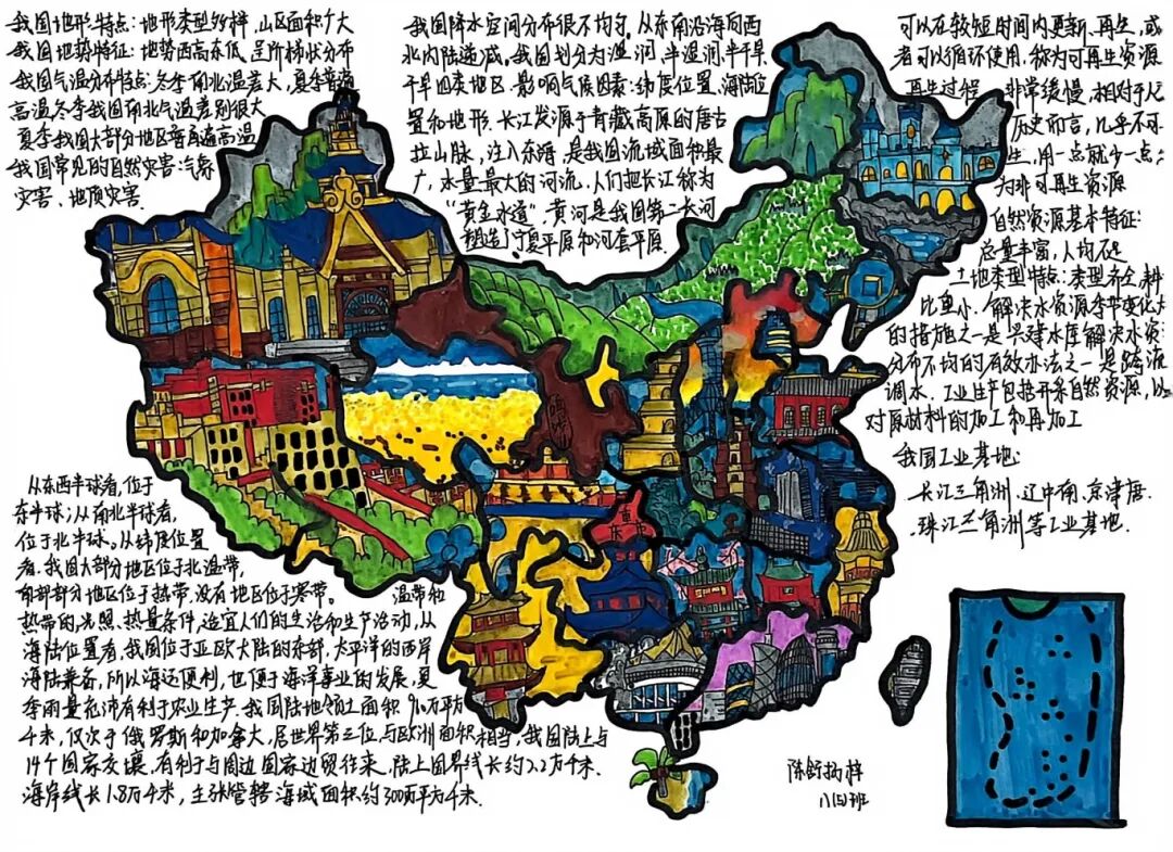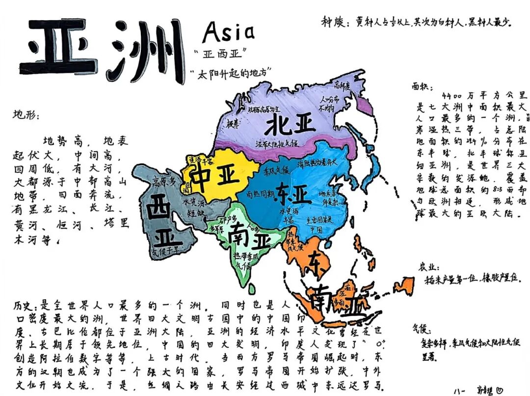 【细化梳理·知识探寻】与此同时,还有同学选择用画笔丈量世界——亚洲的辽阔草原、欧洲的蜿蜒海岸,在他们笔下铺展成色彩斑斓的画卷;水循环的蒸腾与降水,被清晰的箭头与灵动的图标串联成生动的故事。手抄报上,不仅有地理知识的精准梳理,更有一份对远方的好奇与向往。