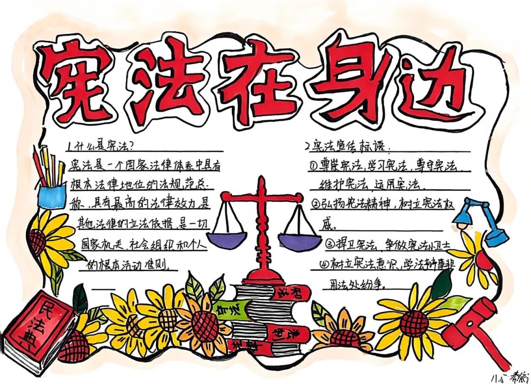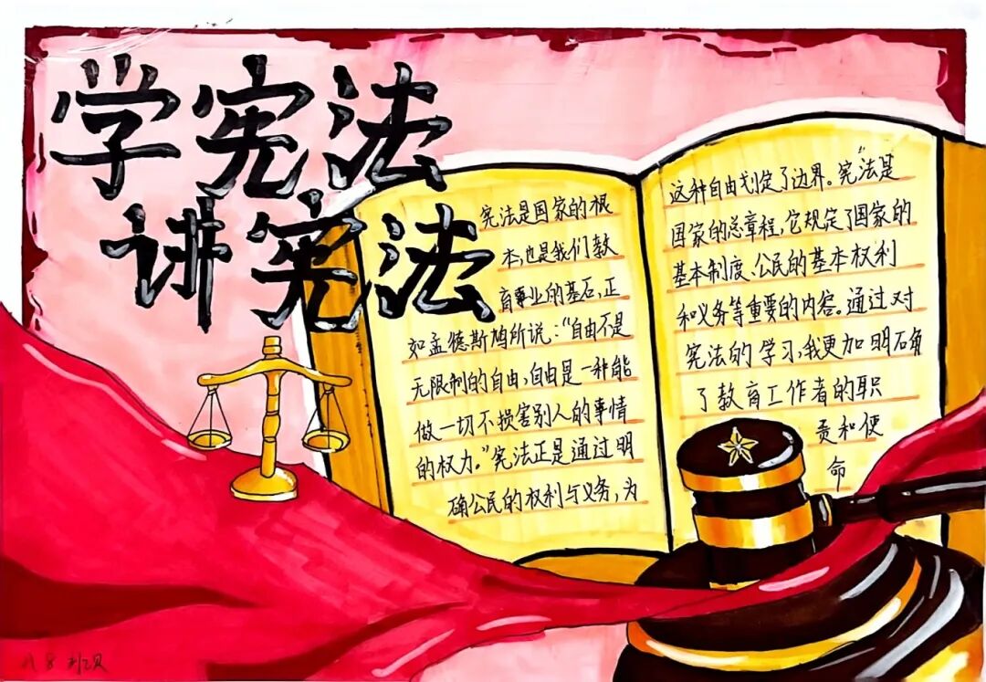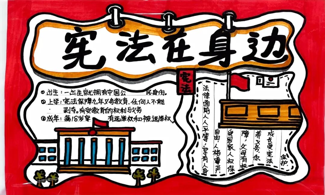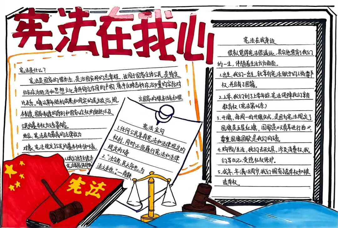 【宪法在身边·法治启蒙】 同学们围绕“宪法”主题,搜集资料、精心排版。通过创作,他们深刻认识到宪法并非纸上冰冷的条文,而是与每个人的生活息息相关,法治的种子在心中悄然生根。