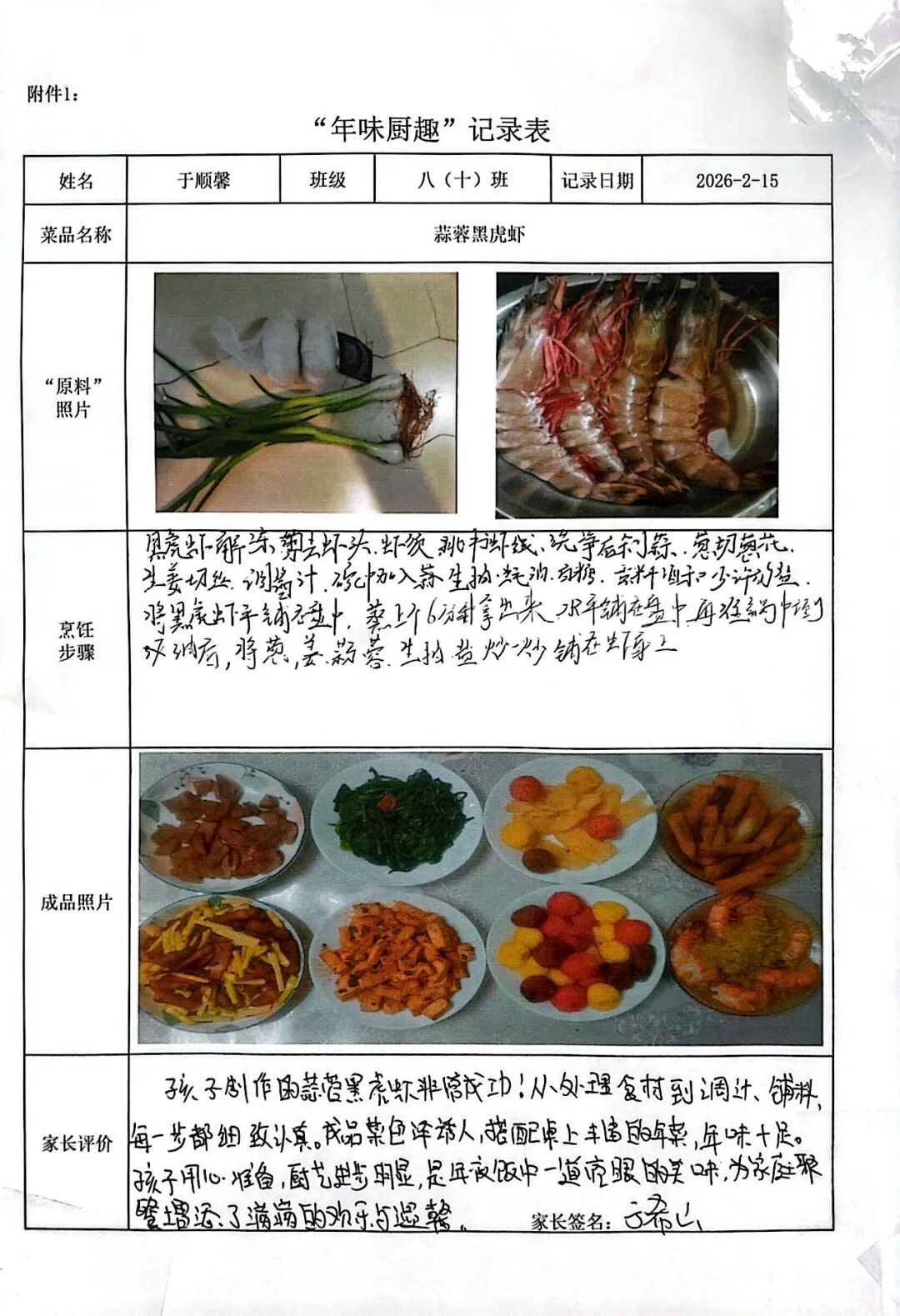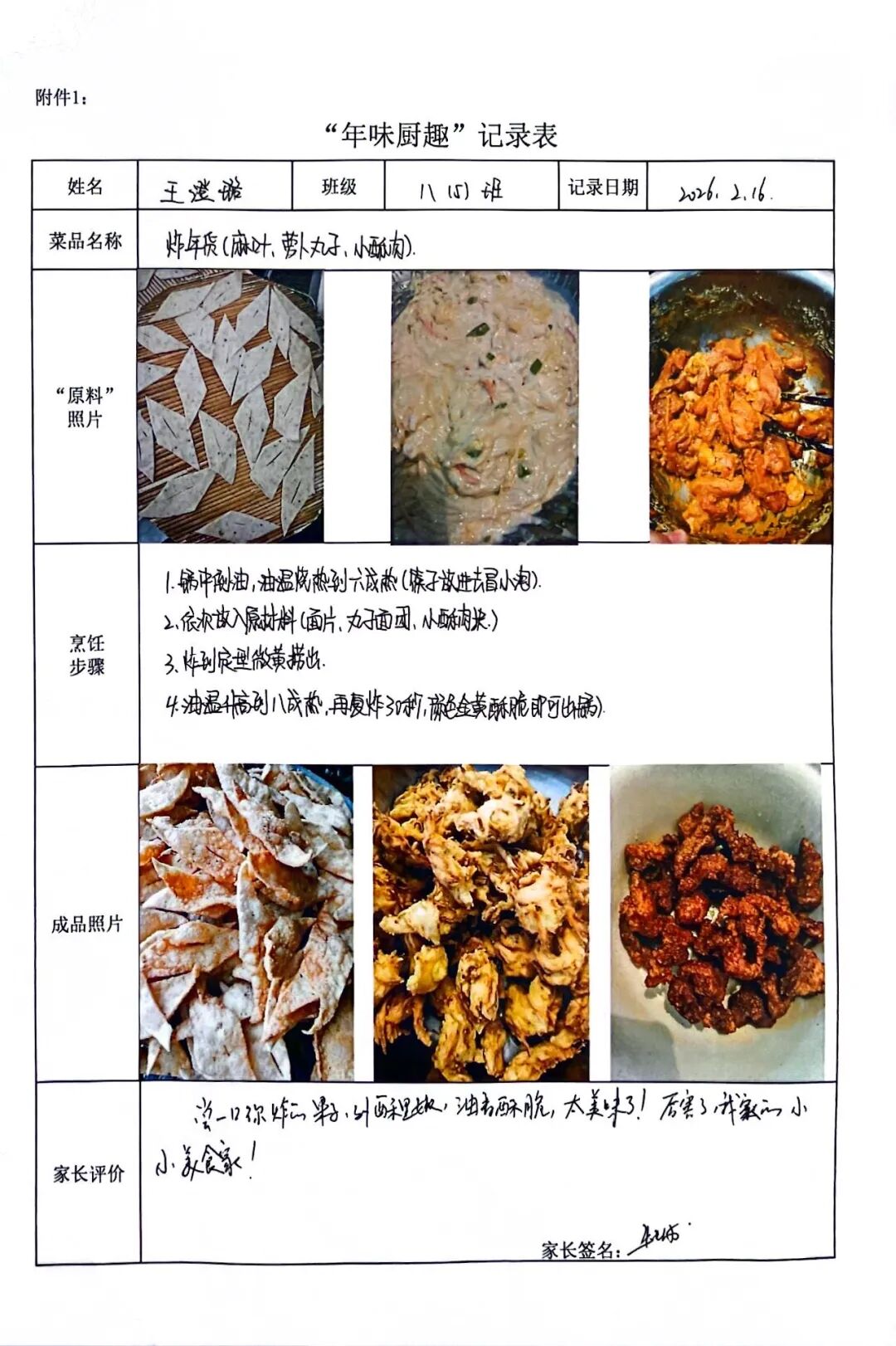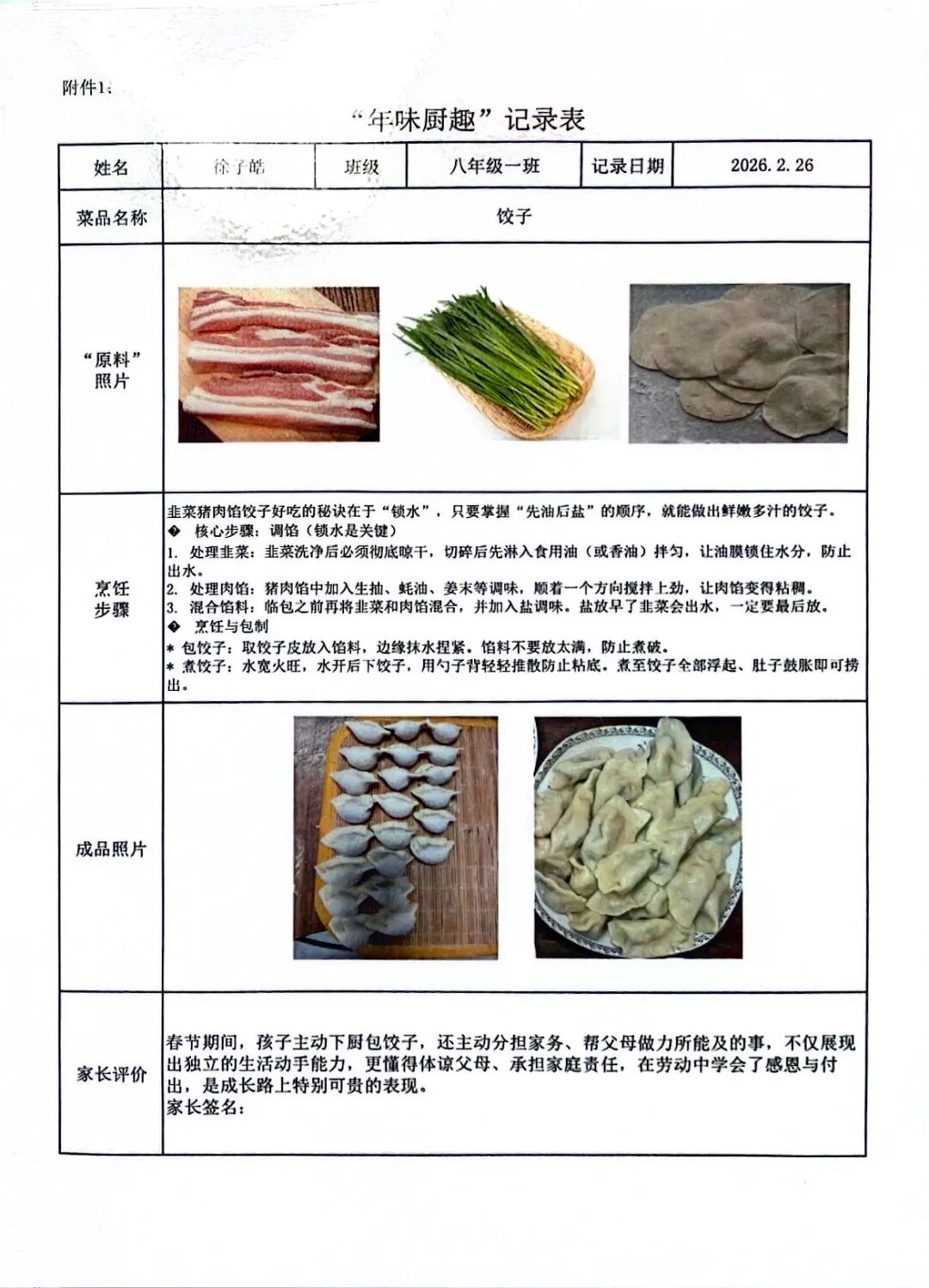 【年味厨趣·知恩懂礼】围裙系上的是责任,灶台升起的是温情。同学们从选材备菜到掌勺烹饪,独立完成一道充满年味的佳肴。作业中,不仅有清晰的步骤图解和诱人的成品特写,更流淌着对父母辛劳的深刻体谅。这一餐饭,让孩子们在烟火气中读懂了“一粥一饭,当思来处不易”,将感恩之心化为实际行动。