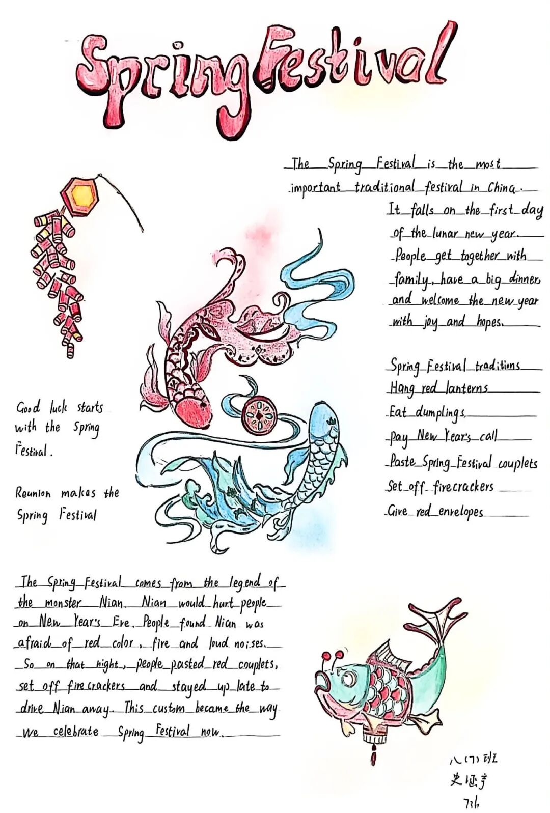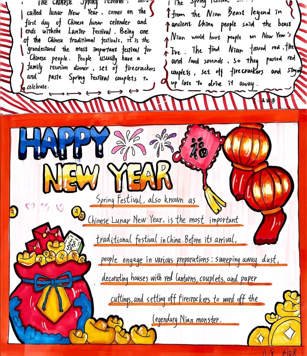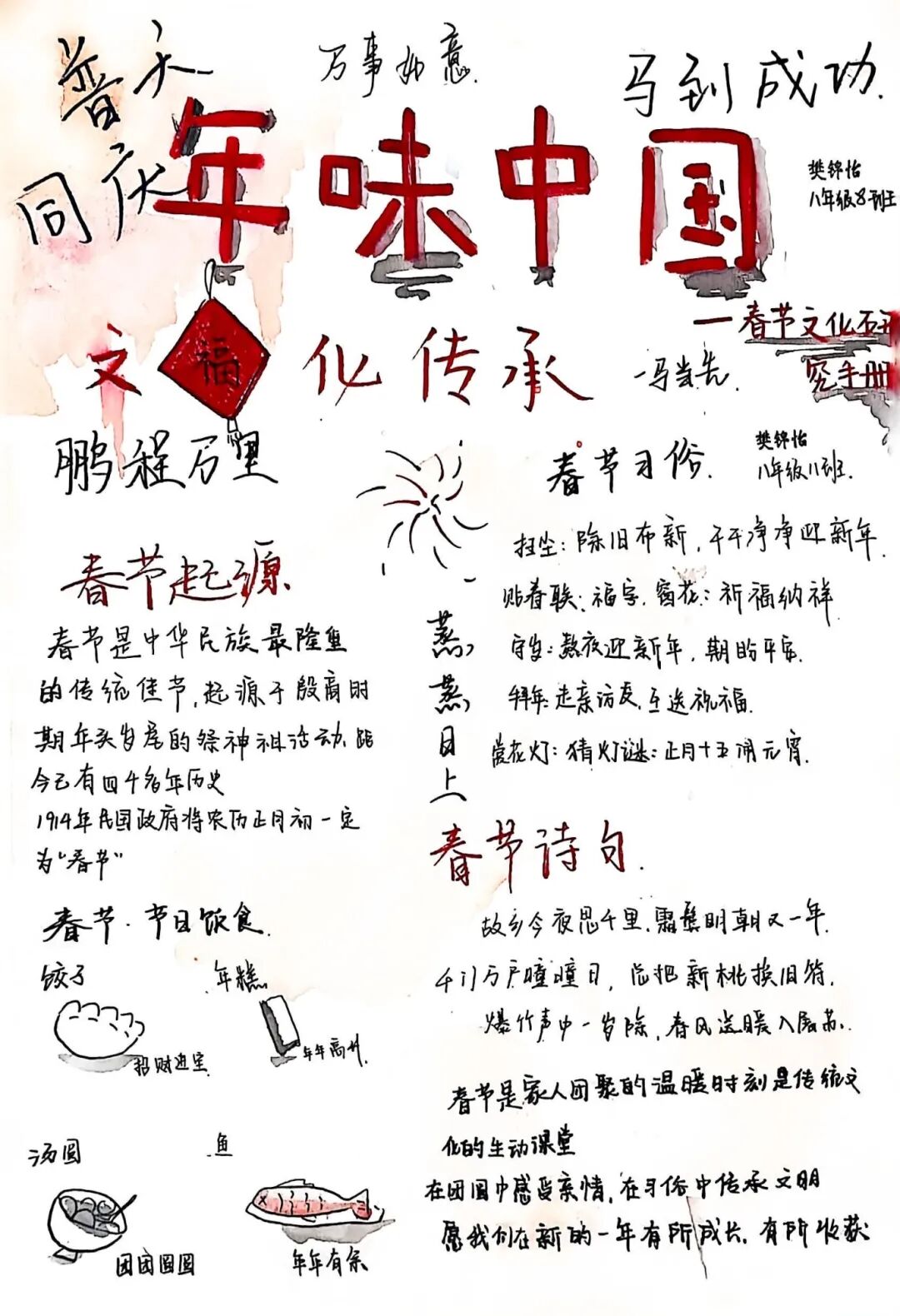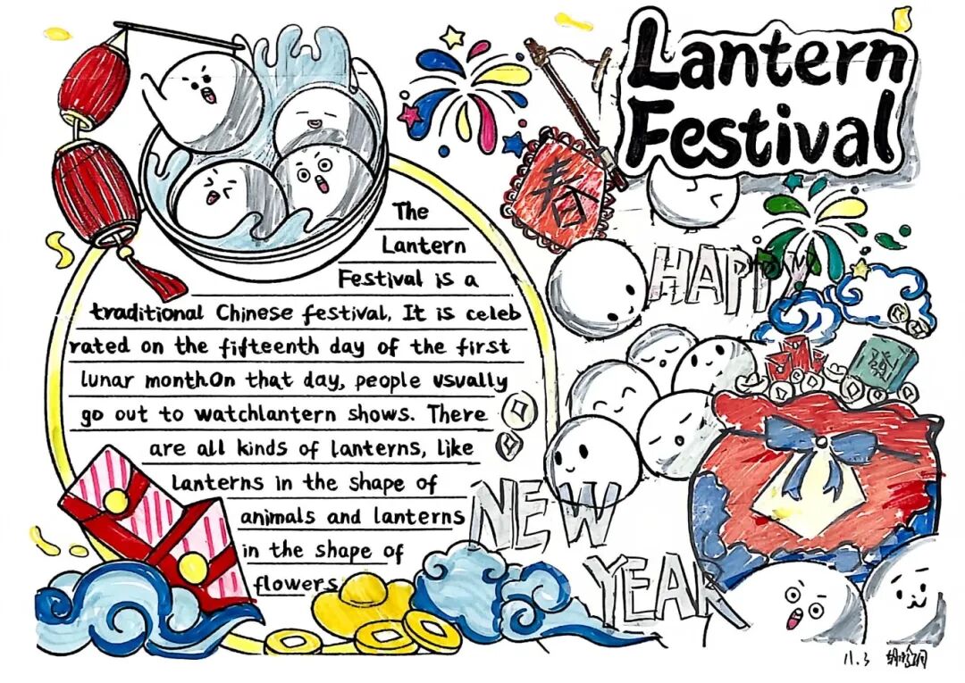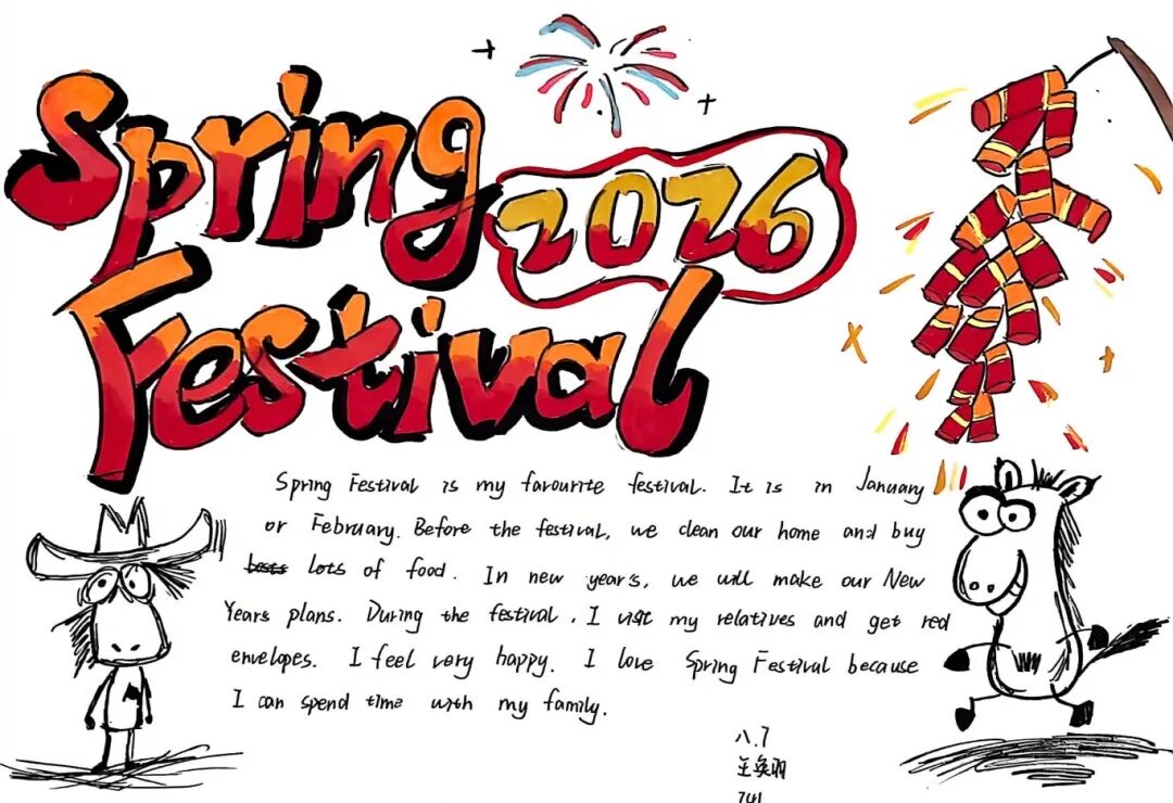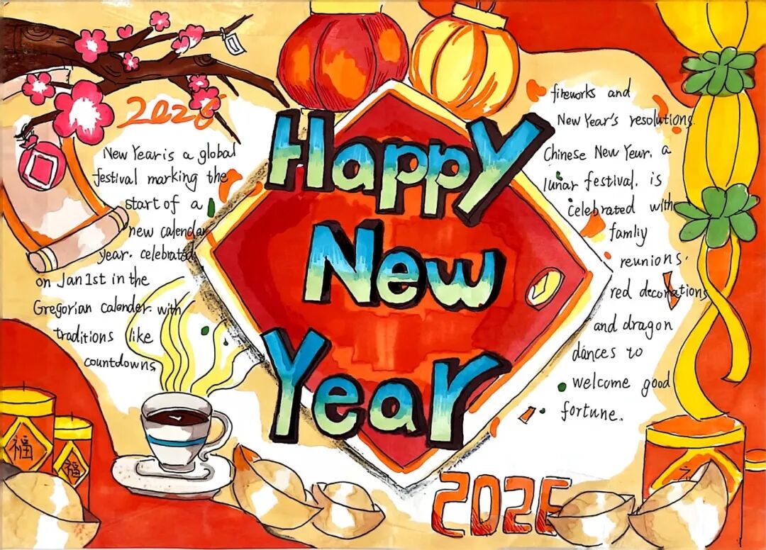 【春节手抄报·文化名片】同学们用流利的英文和绚丽的色彩,将春节的起源、习俗、美食呈现于纸上。这不仅是一份作业,更是一张张向世界讲述中国故事的“文化名片”。