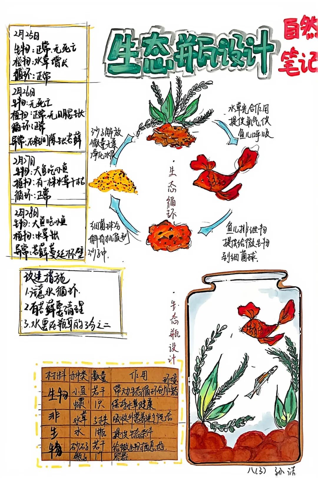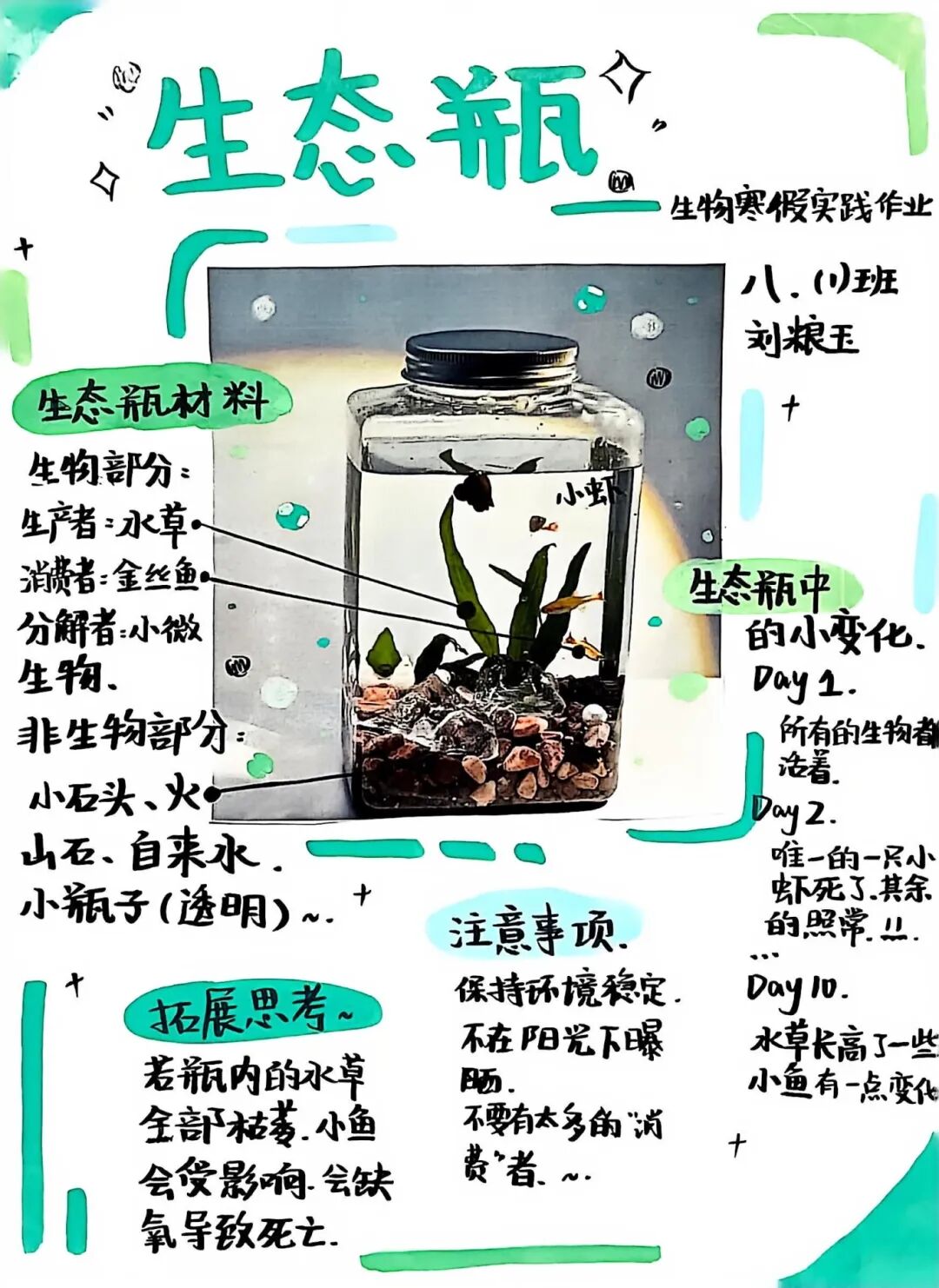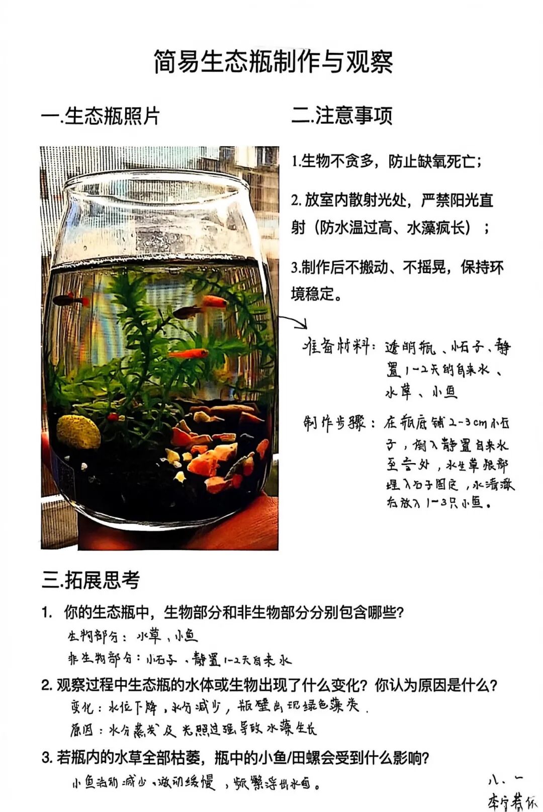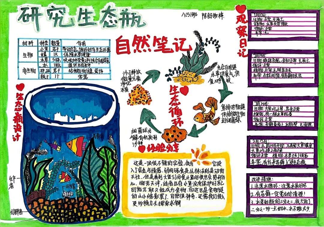 【生态瓶·生命观察】一个小小的玻璃瓶,就是一个微型的生态系统。孩子们放入水草、小鱼、小虾,构建起一个自我循环的生命世界。在每日的观察与记录中,他们真切感受到了生命的奇妙与生态的平衡。