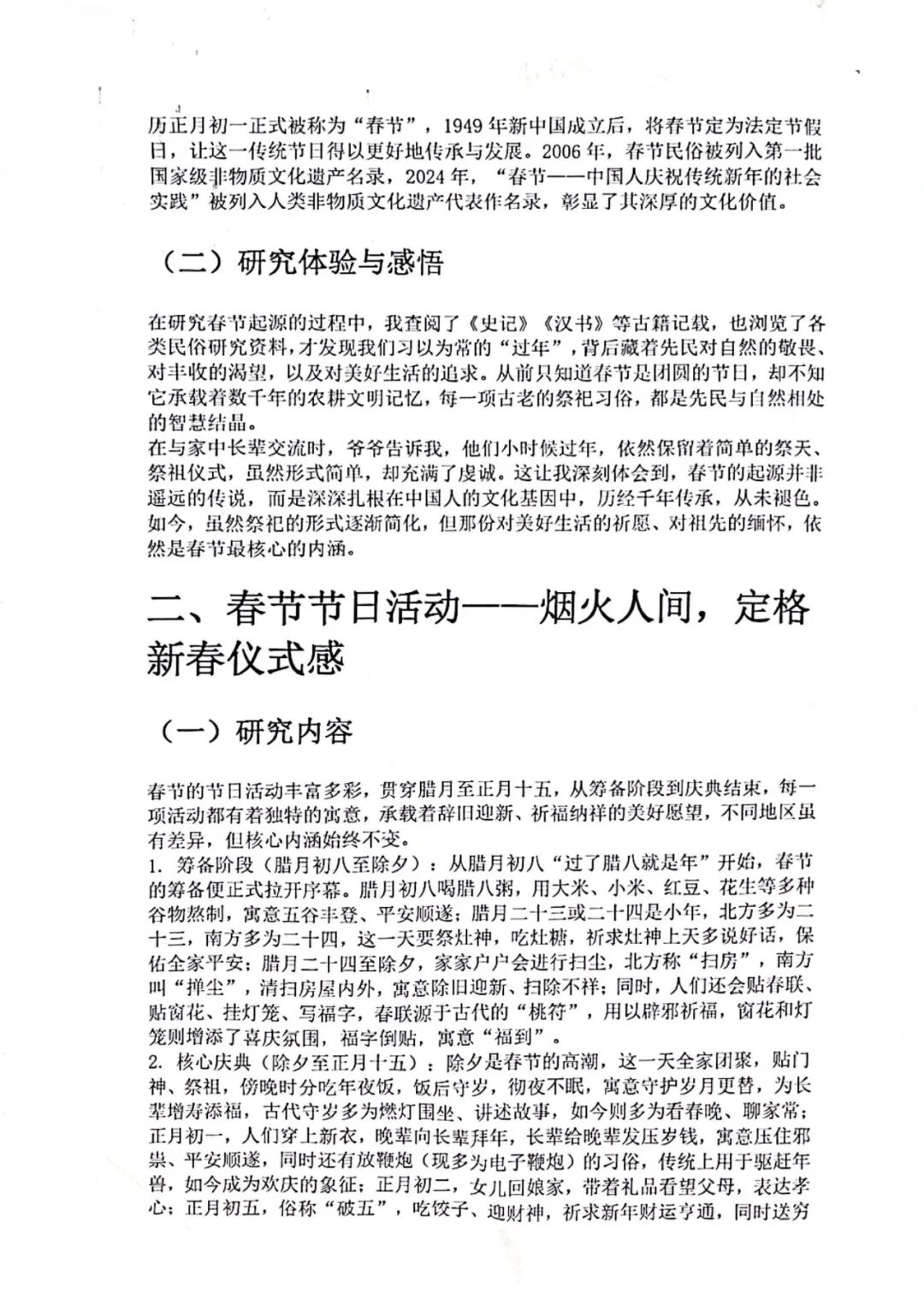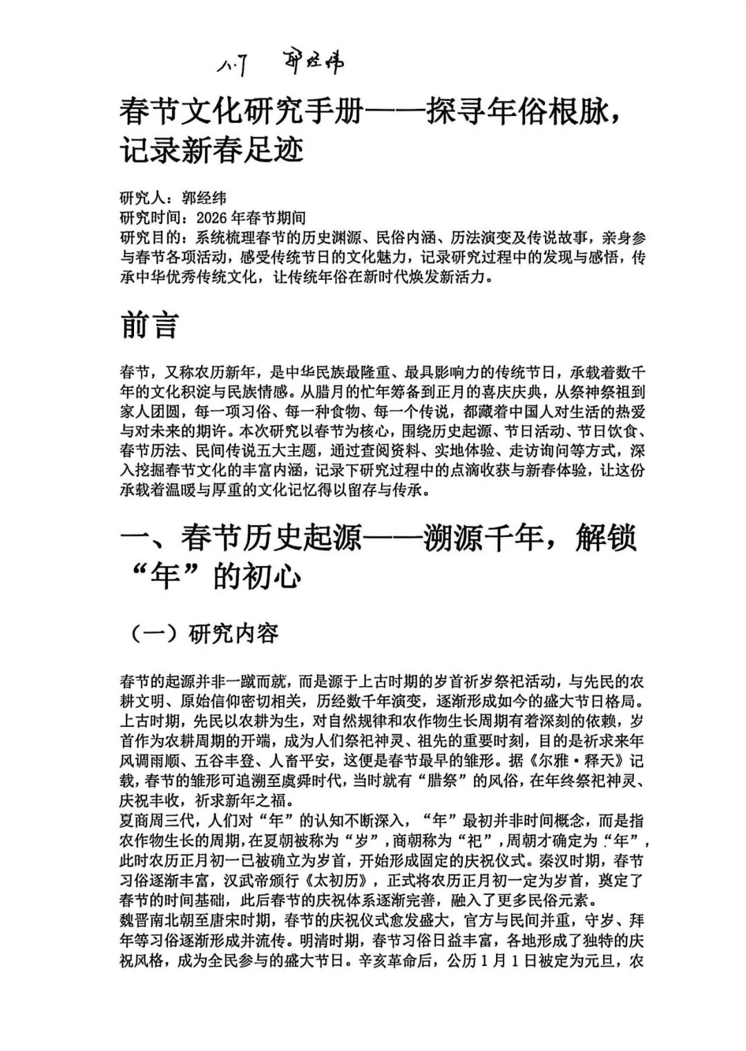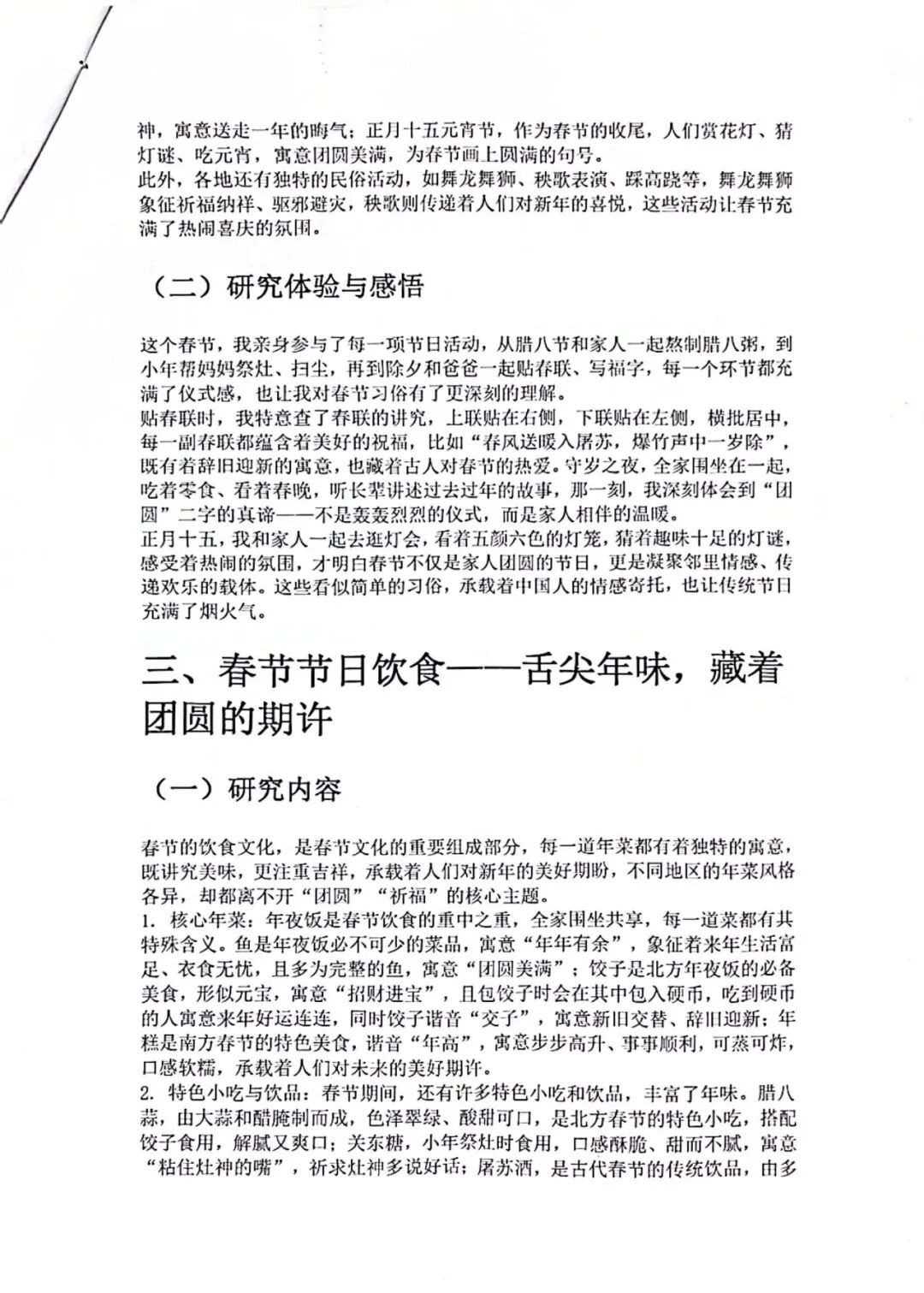 【新春文化研究手册·深度探究】如果说前两项是感性的表达,那么这本《新春文化研究手册》则是理性的深耕。同学们化身为“小小民俗学家”,走出家门,通过实地走访、文献查阅、访谈长辈等方式,对春节的起源演变、地域习俗差异、传统饮食文化等进行系统性梳理。手册中,既有详实的调研数据,又有深刻的文化思考;既有对古老传说的考据,又有对现代年味变迁的洞察。