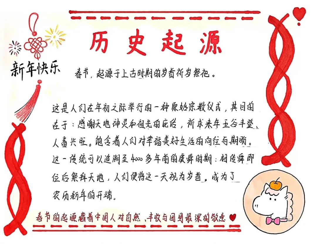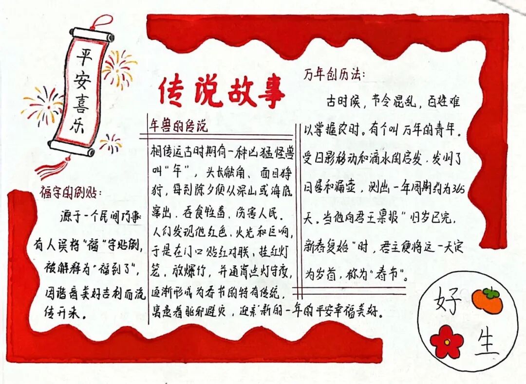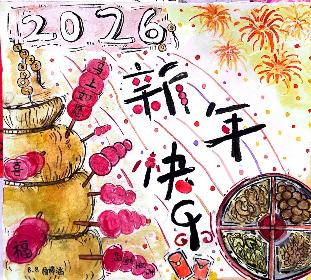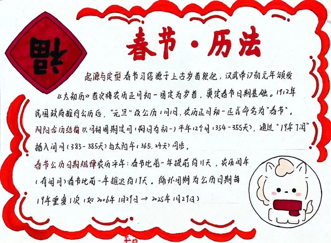 【新春手抄报·笔下的节俗】还有的同学选择用画笔梳理年味——从腊月的祭灶到正月的拜年,从南北的饮食差异到流传千年的神话传说,新春的节俗在笔下铺展成一幅幅色彩斑斓的长卷。手抄报上,不仅有知识的精准梳理,更有一份对传统最深情的回望。
