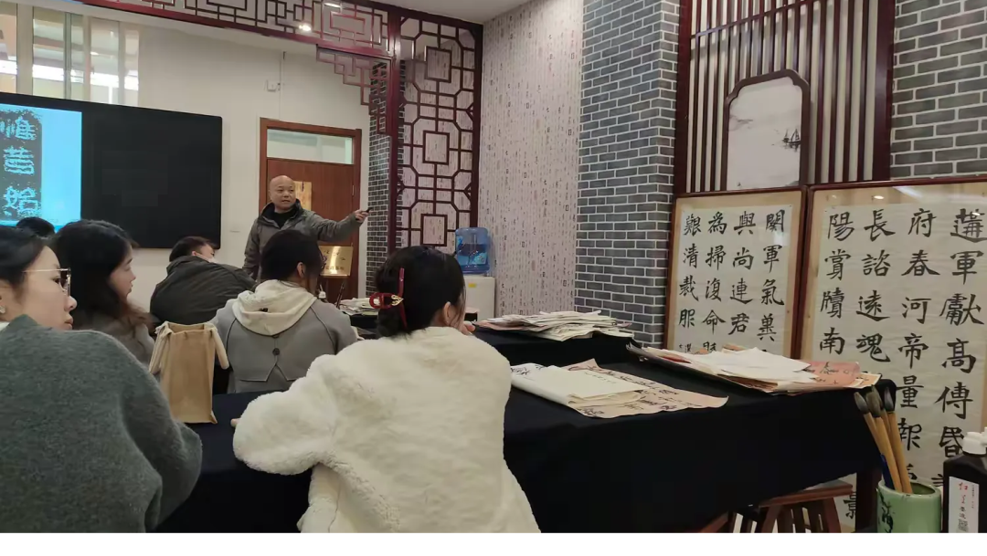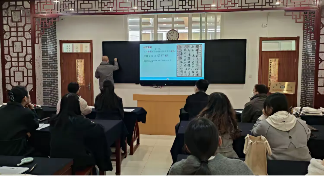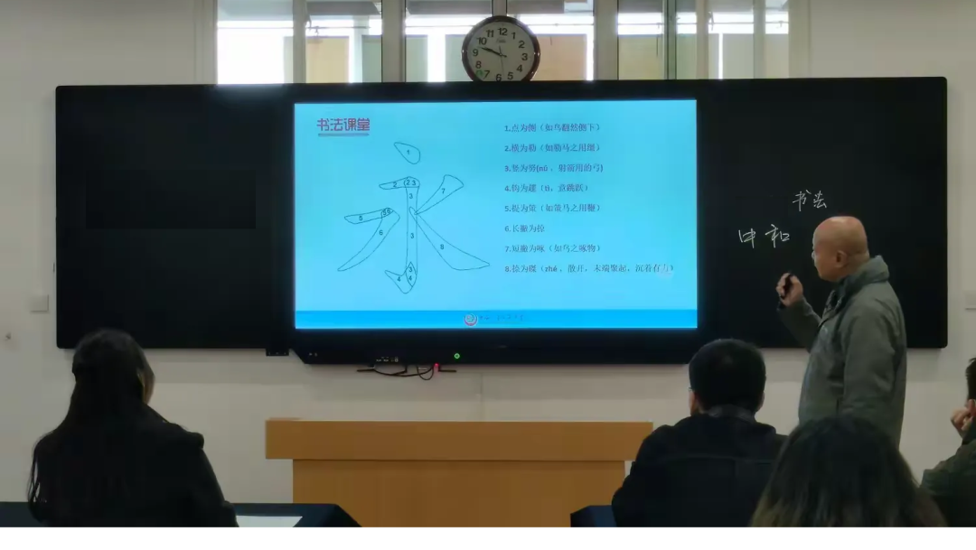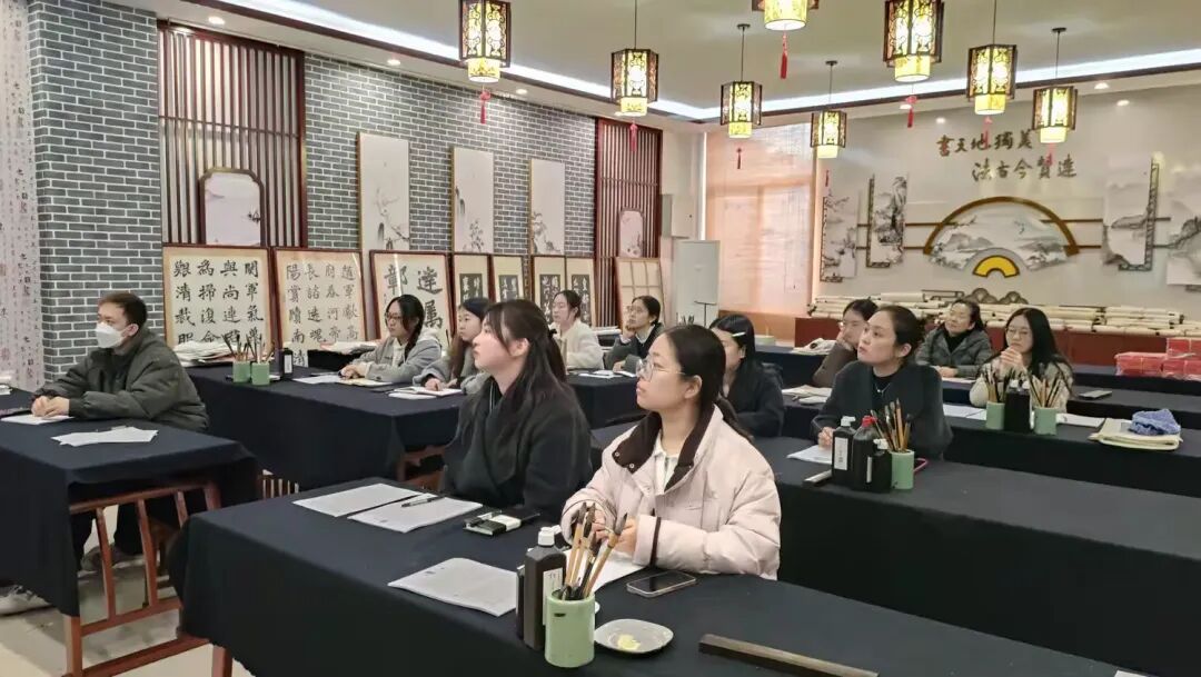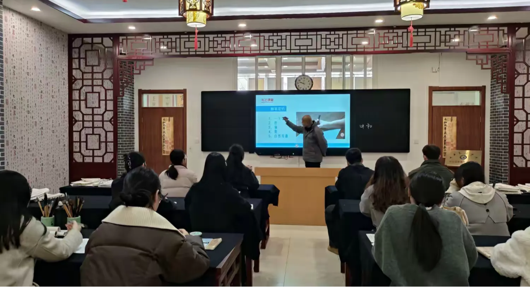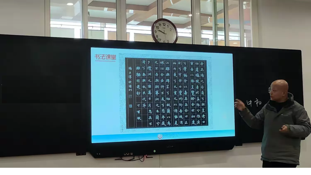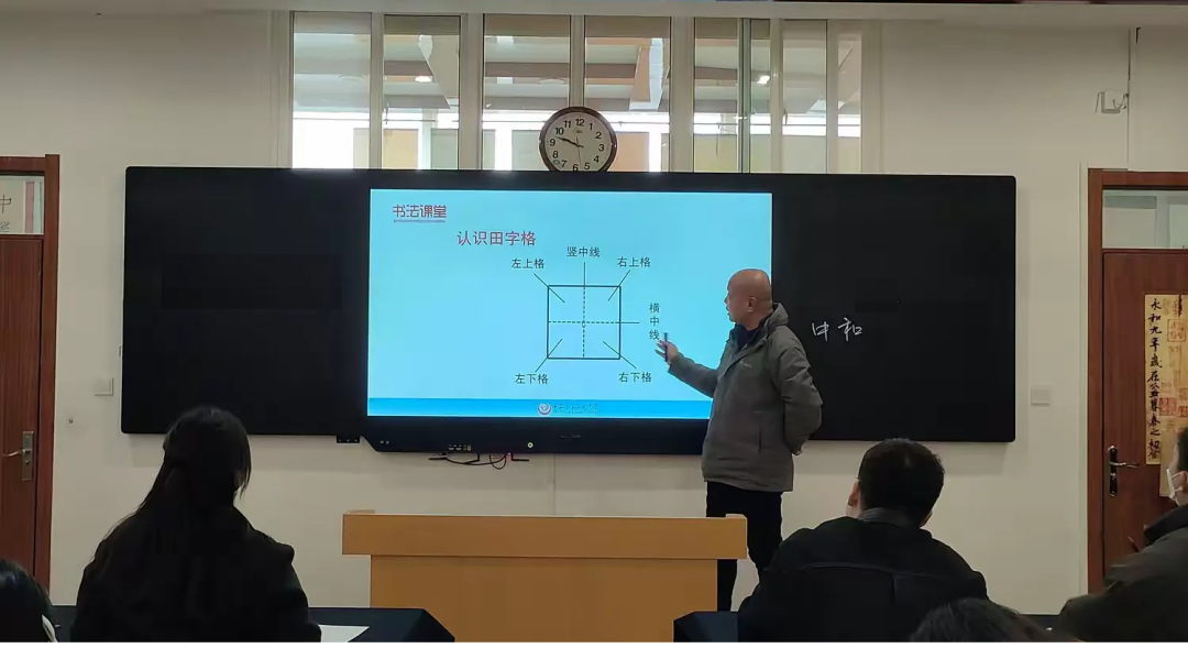 李明老师围绕书法发展史、字体与书体、书法审美、经典书法与江湖书法辨析展开讲解,带领大家溯源书法史、感悟汉字文化。随后躬身示范坐姿、握笔姿势和运笔力度,强调 “姿正笔正,身正字正”。