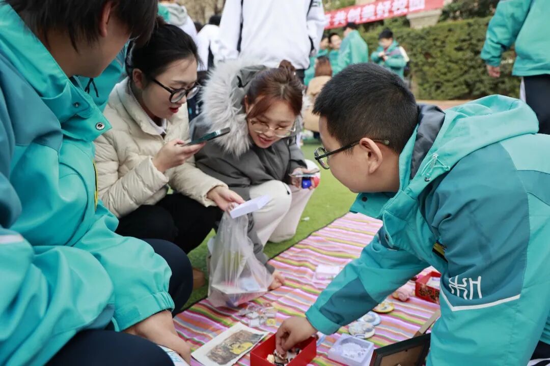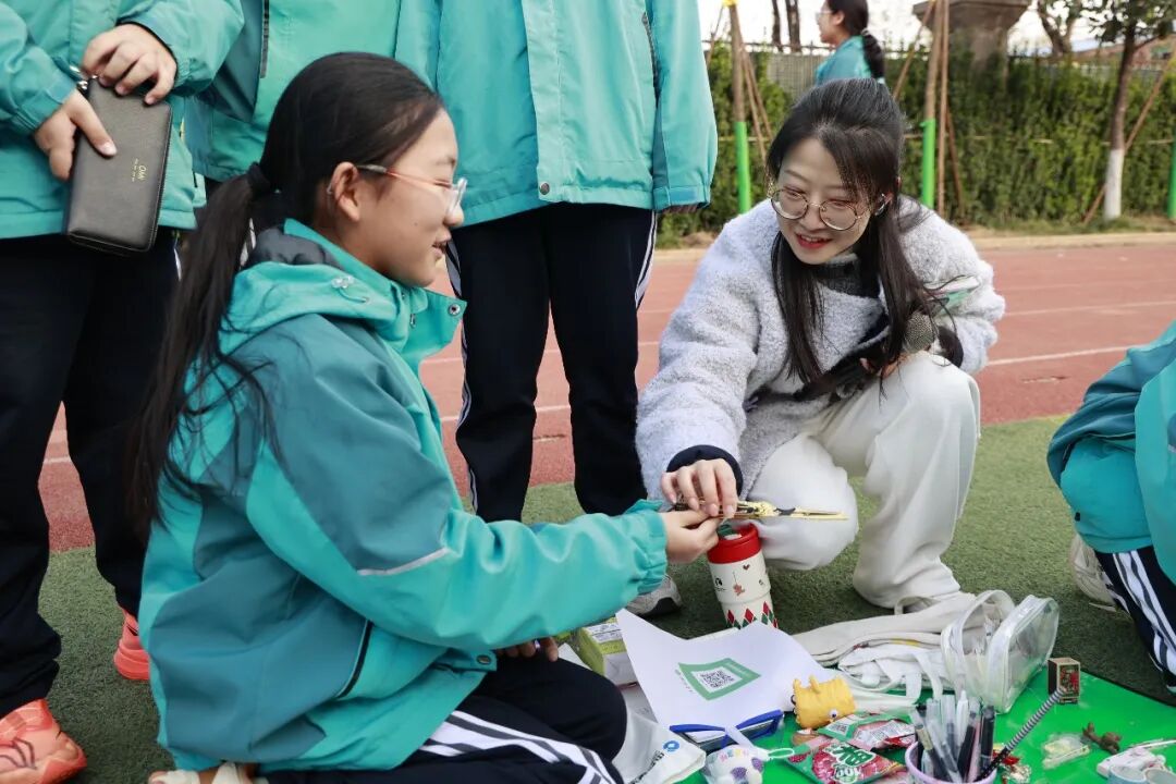 活动现场熙熙攘攘,学子们自由组队化身 “小摊主”,分工协作布置摊位、手绘英文创意海报,书籍、文具、玩偶、小饰品等闲置好物琳琅满目。交易全程,大家用英语介绍商品、讨价还价,沉浸式交流让同学们克服表达胆怯,大胆展现英语能力。老师们穿梭其间,既是参与选购的 “顾客”,也是英语口语的指导者,适时为学生提供表达点拨。