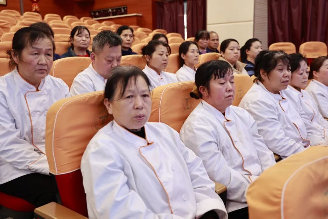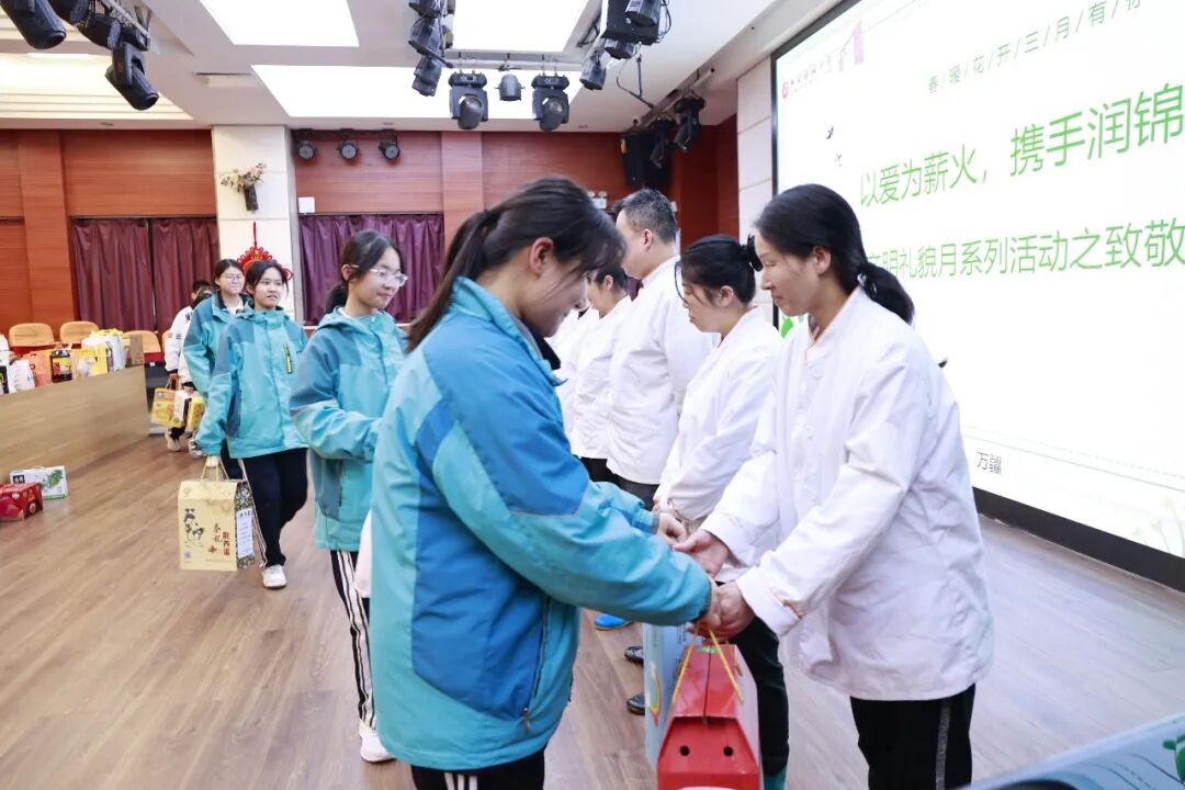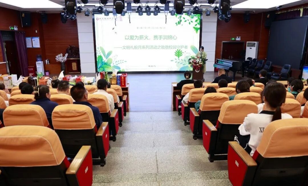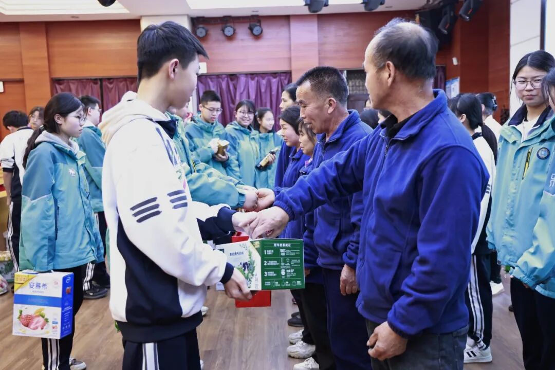 随后,学子们返回学校报告厅,与坚守一线的工勤保安师傅们温情相聚、表达敬意。这份敬意,既有对平凡劳动者的尊重,更有学子们在团委引领、家长熏陶下滋生的感恩之心——他们亲手将准备好的慰问物资送到师傅们手中,用稚嫩却真诚的话语,感谢师傅们日复一日的默默坚守:晨曦中,他们坚守门岗,守护师生平安入校;暮色里,他们巡逻值守,排查每一处安全隐患;平日里,他们主动帮扶、默默奉献,用脚步丈量责任,用坚守筑牢校园安全防线。学子们坦言,正是团委的引导让他们懂得了“平凡亦伟大”,正是家长的教育让他们学会了“感恩与担当”,师傅们的坚守,是最生动的榜样,值得每一个人学习。