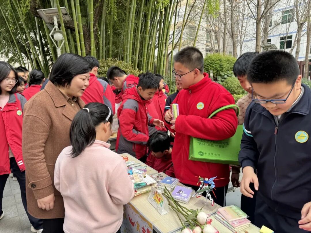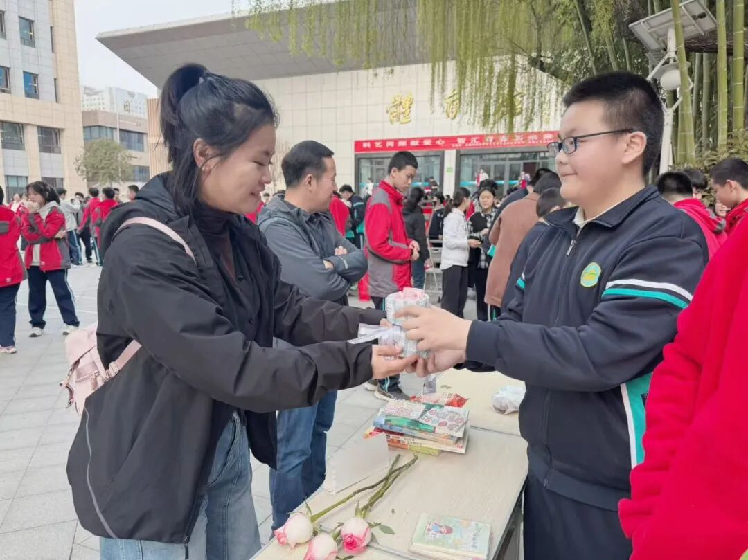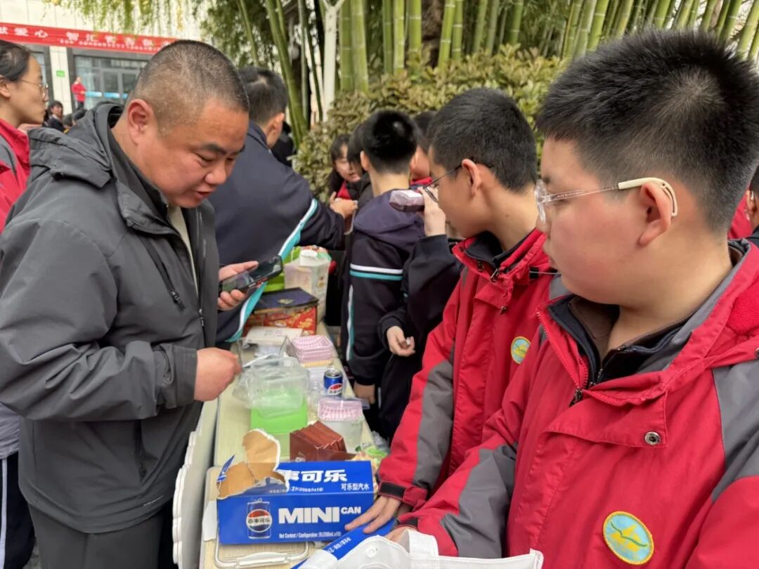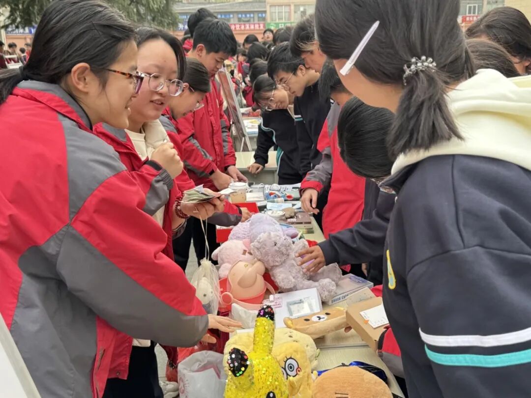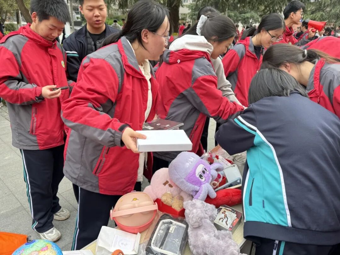 启动仪式后,义卖火热开启。各班摊位整齐排布,同学们化身摊主推介闲置物品:活力的吆喝声、体验式营销、表演引流----现场人头攒动,师生踊跃参与,每一笔交易都汇聚善意,让向善之花绽放校园。