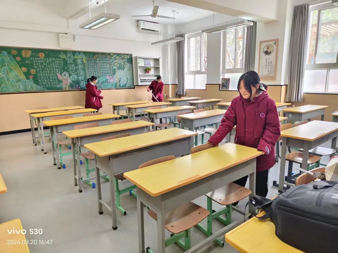 为深入贯彻落实立德树人根本任务,对标《新时代陕西省立德树人工作指南》要求,紧扣西安市教育局“四季长安”德育系列活动春季“传统美德传承季”工作部署,近日,西安市第二十六中学教育集团联动开展“优美教室、优美宿舍、优美办公室”评比活动。本次活动以劳动教育为抓手,将环境育人与美德涵养深度融合,让劳动之美浸润心灵,让环境之美滋养成长,切实把立德树人要求落到校园建设与日常教育的实处,在春日校园奏响立德树人、五育并举的生动育人乐章。