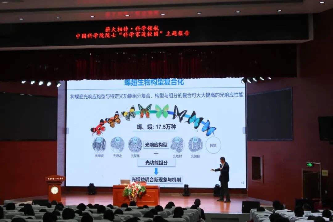 张院士团队的科研成果已成功应用于中国空间站、嫦娥探月工程等国家重大工程,为航天器结构减重、性能提升提供关键支撑。他特别为同学们介绍了“向自然学习”的科研理念:从贝壳、蝶翅、甲壳虫的生物拓扑结构中汲取灵感,提出微纳砖砌构型化复合与遗态材料的创新思路,将人工材料制备与生物亿万年进化的精细结构相结合,研发出高强高韧、高效散热、智能变色等新一代功能材料,为航天热控、建筑节能、太阳能发电等领域提供全新解决方案。