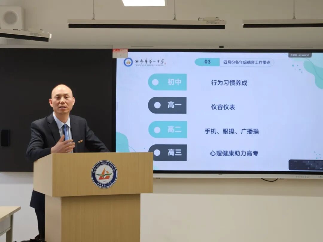 会上,德育处两位主任分别就各年级月度常规管理中特色管理办法、阶段管理成效,问题反馈、典型教育案例等与大家进行交流,并强调了下一月段和学段的工作任务、目标和重点:初中重视习惯养成和纪律管理,高一年级强化仪容规范检查和班集体建设,高二年级加强两操管理和校园手机查禁,高三年级做好家校协同和考前心理健康辅导与调适。