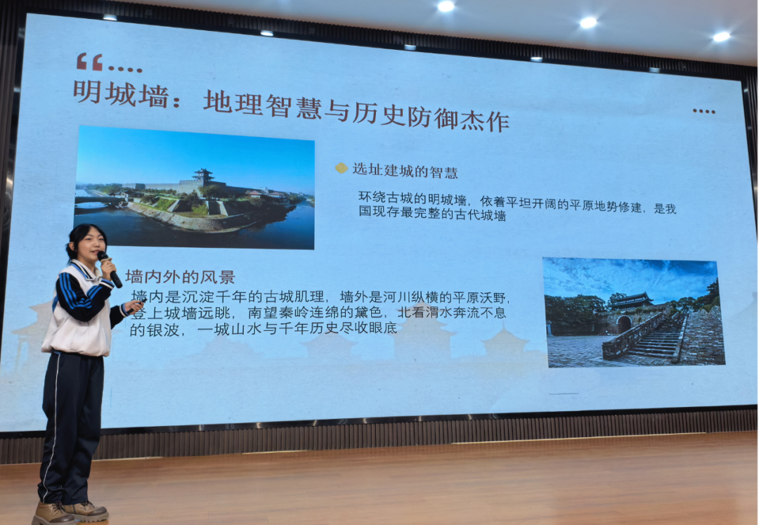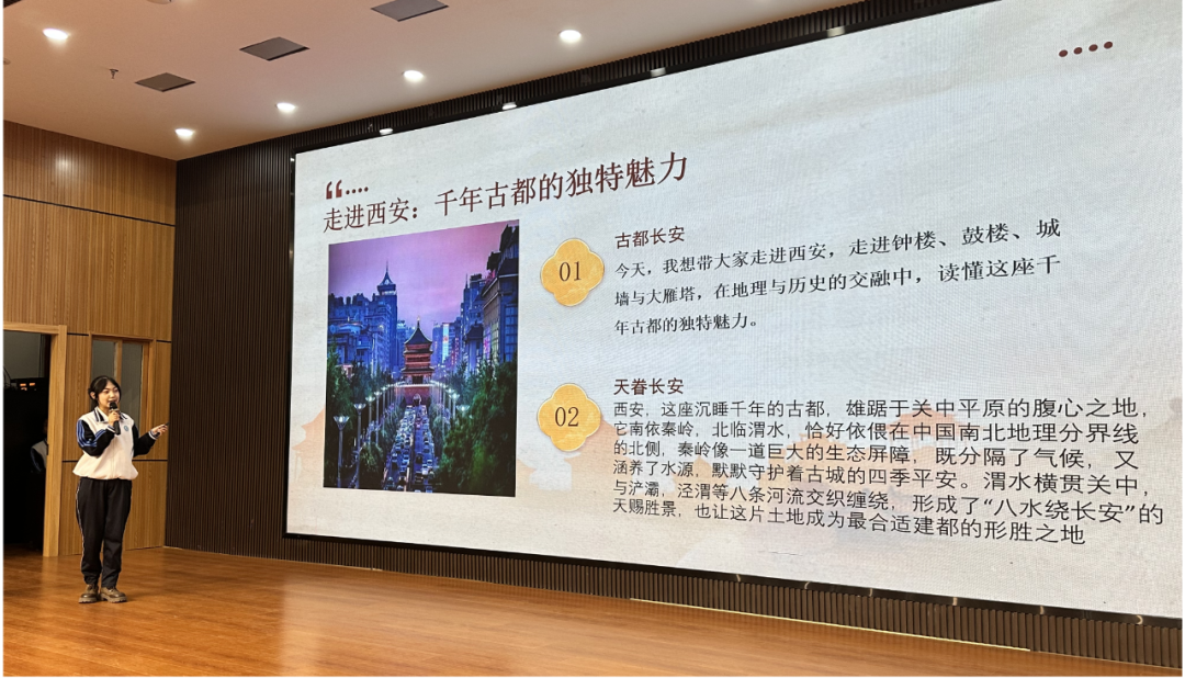 初二(2)班胡晨钰同学带领大家重新认识千年古都长安城,揭示其巧妙的设计和精湛的建筑技术,分析其厚重的文化传承和人文之美,激发了大家对家乡的热爱、崇敬之情。