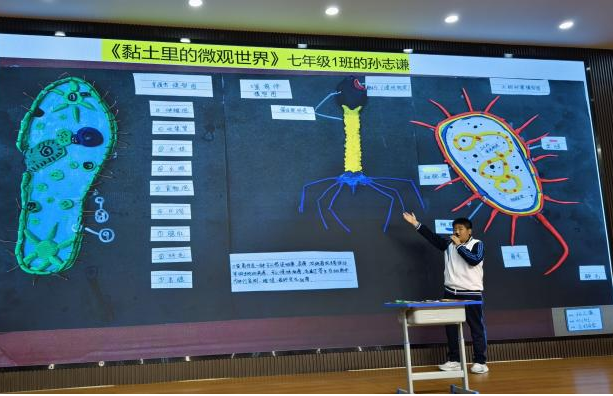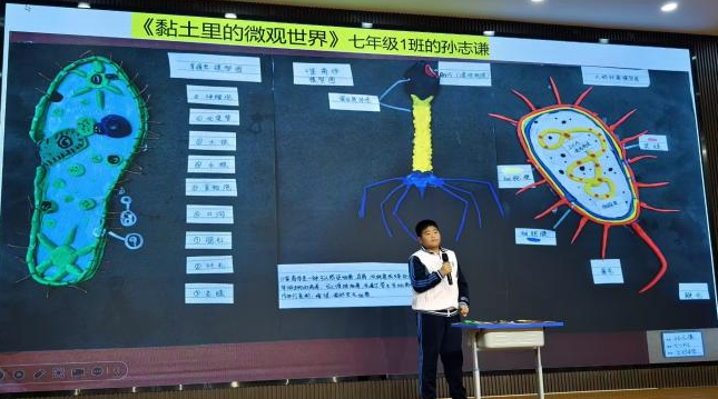 初一(1)班孙志谦同学用五彩黏土,制作噬菌体、草履虫、大肠杆菌等模型图,展示细胞的结构,解读微观世界的密码。