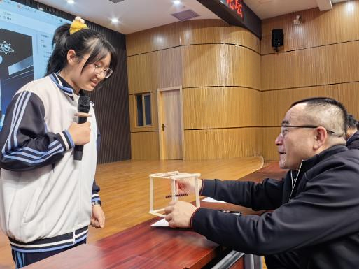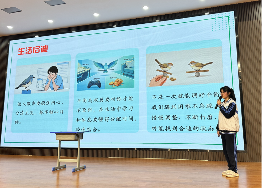 初二(16)班赵欣怡同学通过展示自制的“平衡鸟”,以简单装置揭示物理学中的平衡原理,让大家颇受启发。