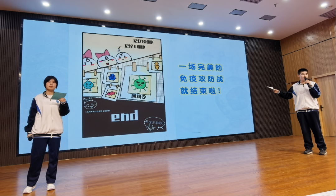 高二(1)班赵睿冰、闫浩琛、李张扬三位同学通过动漫展示免疫细胞的病毒攻防大战,揭示人体免疫系统工作原理,展现生命的智慧和顽强。