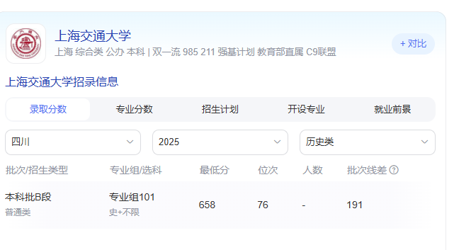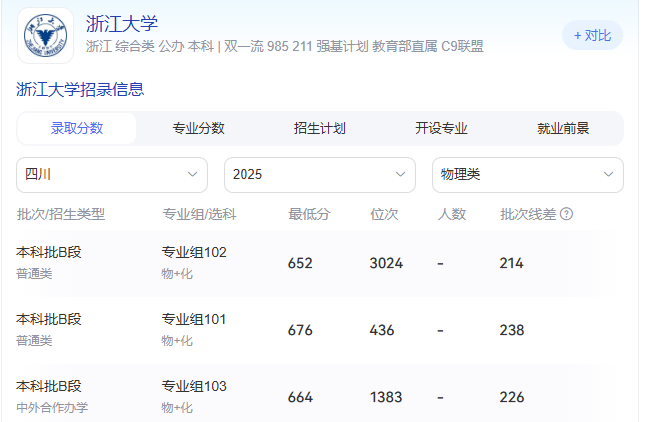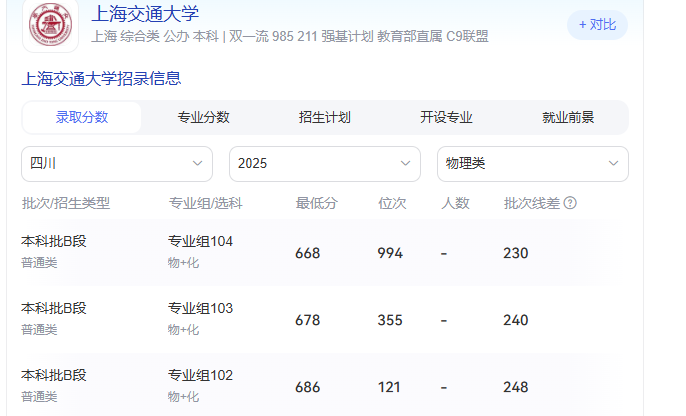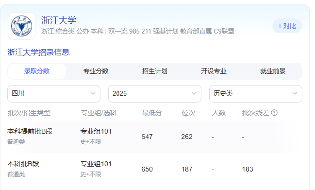 澳大利亚昆士兰大学2026年QS排名42位,而排名在47位的上海交通大学、排名在49位的浙江大学2025年在四川省物理类和历史类录取分数如下图所示: