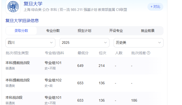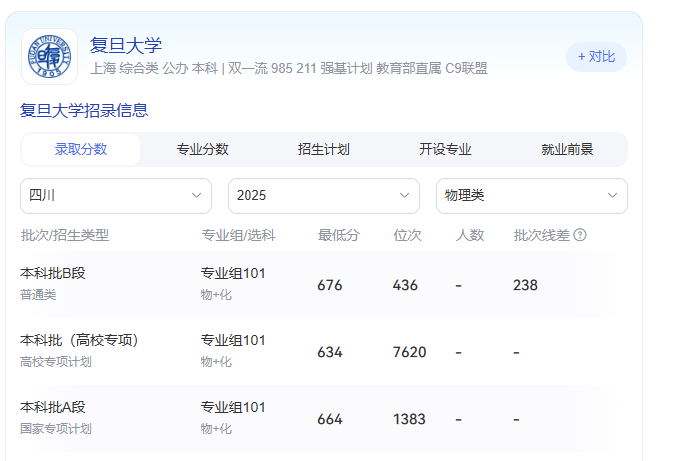从QS排名维度看,学院合作的海外大学展现出强劲的国际竞争力。澳大利亚国立大学2026年QS排名32位,澳大利亚蒙纳士大学在2026年QS排名36位。而排名在30位的复旦大学2025年在四川省物理类和历史类录取分数如下图所示: