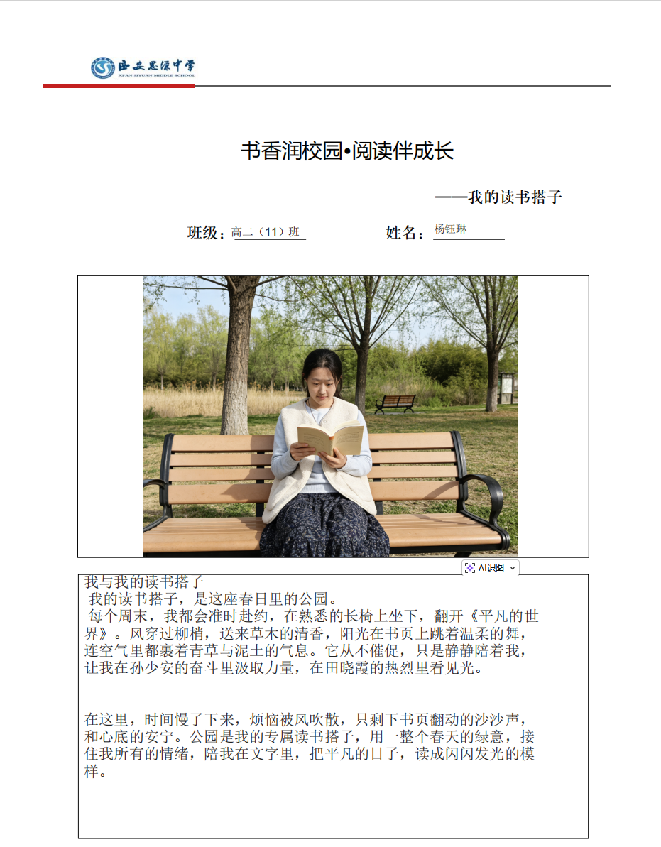 在众多作品中,读书搭子的身影丰富多彩。有的同学以可爱的小猫为搭子,在午后的阳光下,猫咪蜷缩在身旁,陪着自己在文字的世界里遨游,静谧又美好;有的同学选择一枚精致的书签作为搭子,每一次翻书,书签都默默陪伴,标记着阅读的足迹,见证着知识的积累;还有的同学偏爱在公园的长椅上阅读,清风、绿植、鸟鸣成为最自然的读书搭子,让阅读与自然相融,收获别样的惬意。