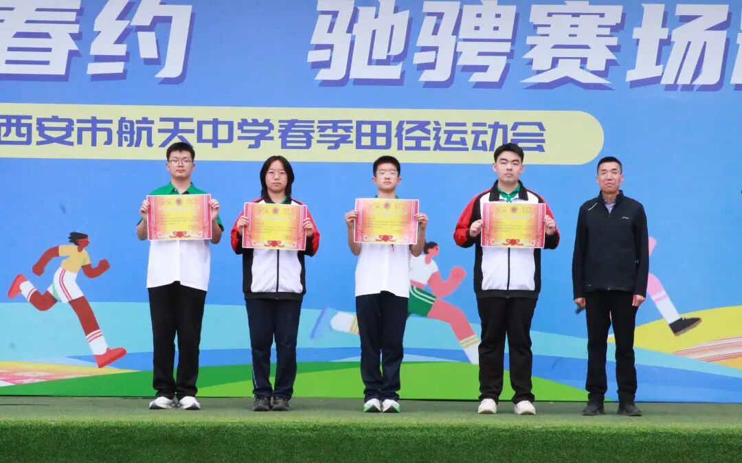 西安市航天中学党总支书记侯建峰、西安市航天中学校长丁宝林、西安市航天中学副校长张引杰、西安市航天中学副校长付小静、西安市航天中学副校长张茜共同参加了运动会开幕式。