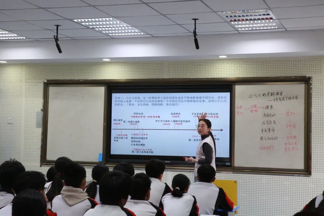 研讨会现场,西安市航天中学陈若怡老师和九年级(1)班学生共同进行了《近代化的早期探索——千年变局下的求索》主题复习课。课程设计了温故知新、寻因探果、国际视野、史料实证四个层层递进的任务,将洋务运动、戊戌变法、辛亥革命、新文化运动等分散知识点整合为结构化体系,并与列强侵略、世界变化构建关联,在探究中提升学生的历史思维,在课堂最后,引导学生将李鸿章时代的“数千年未有之变局”和当今“世界百年未有之大变局”对比,从历史探索到当代责任,自然融入家国情怀教育,体现历史学科的育人价值。