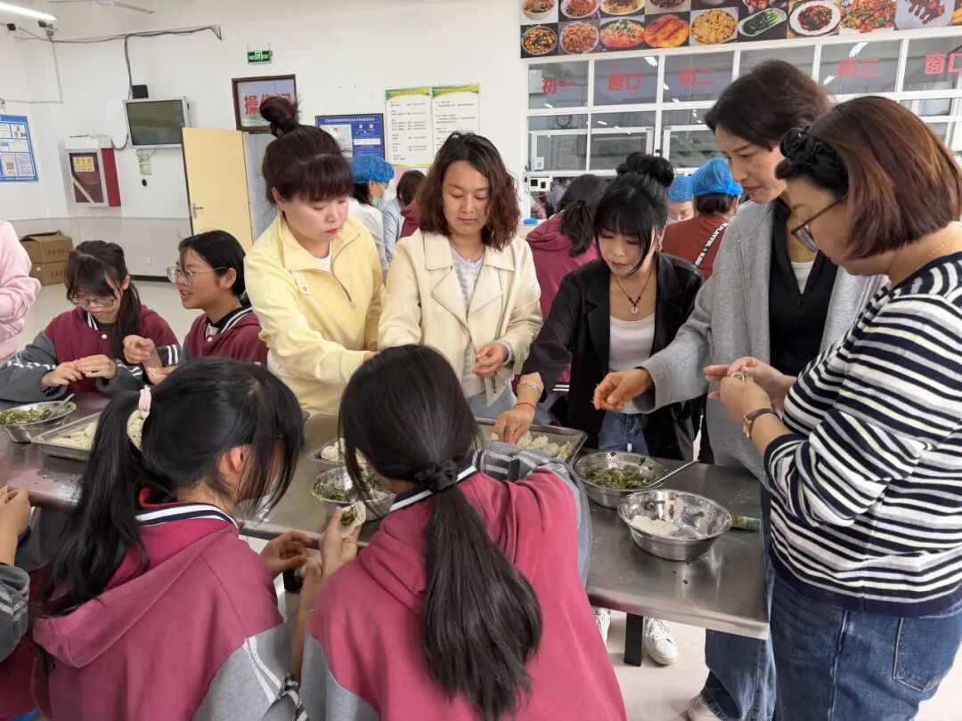 大家分工明确,揉面、擀皮、包饺子,动作从生疏到熟练,指尖翻飞间,一个个形态各异的饺子整齐排列。班主任与任课教师全程陪伴指导,家长代表热情参与,师生同乐、家校携手,欢声笑语充满整个餐厅。