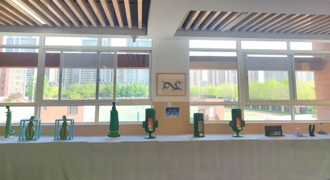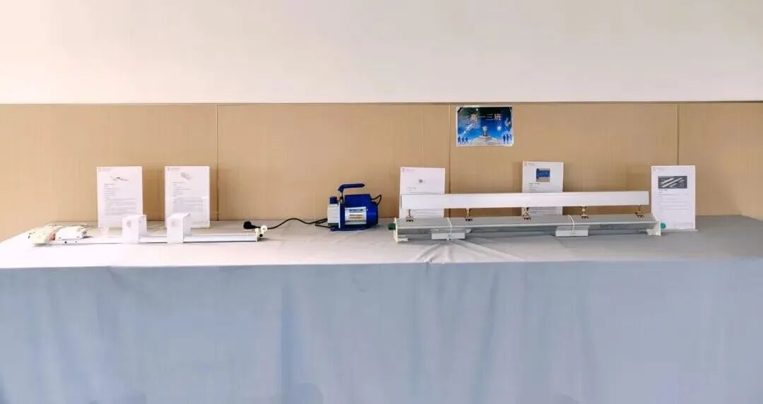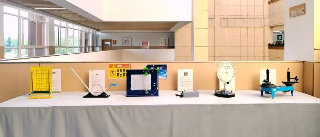 公区展台摆放着各种实验器材和标本模型,处处展示着科学氛围。高一年级的太阳能发电装置点亮了灯光,高二年级学生自行制作的仿生蝴蝶扇动翅膀翩翩起舞。