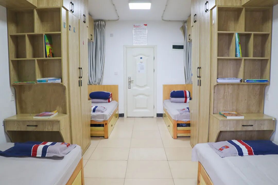 学生公寓采用四人间布局,空间宽敞明亮,冬有暖气,夏有空调,配备独立卫生间、浴室,通过合理的功能分区,为学生营造出温馨、舒适的居住环境,纯实木设施全方位守护学生的健康成长。