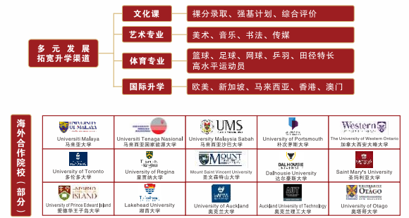 西安藤信高级中学为学子搭建覆盖全路径的成长阶梯。文化课方向,依托裸分录取、强基计划、综合评价等多元升学通道,助力冲刺国内优质高校;艺术专业涵盖美术、音乐、书法、传媒等领域,以艺载道,护航学子逐梦前行;体育专业深耕篮球、田径等特长培养,为高水平运动员开辟专属升学赛道;国际升学直通欧美、新加坡、马来西亚及中国港澳地区名校,采用“语言+学术”双提升培养模式,打破单一升学局限。学子既可深耕本土,成长为担当有为的民族脊梁;亦能放眼全球,成为兼具家国情怀与国际竞争力的时代精英。高考并非唯一选择,海外升学同样精彩纷呈。西安藤信高级中学,为每一位学子的未来,铺就无限可能。