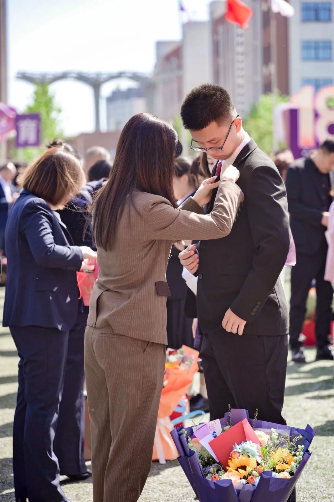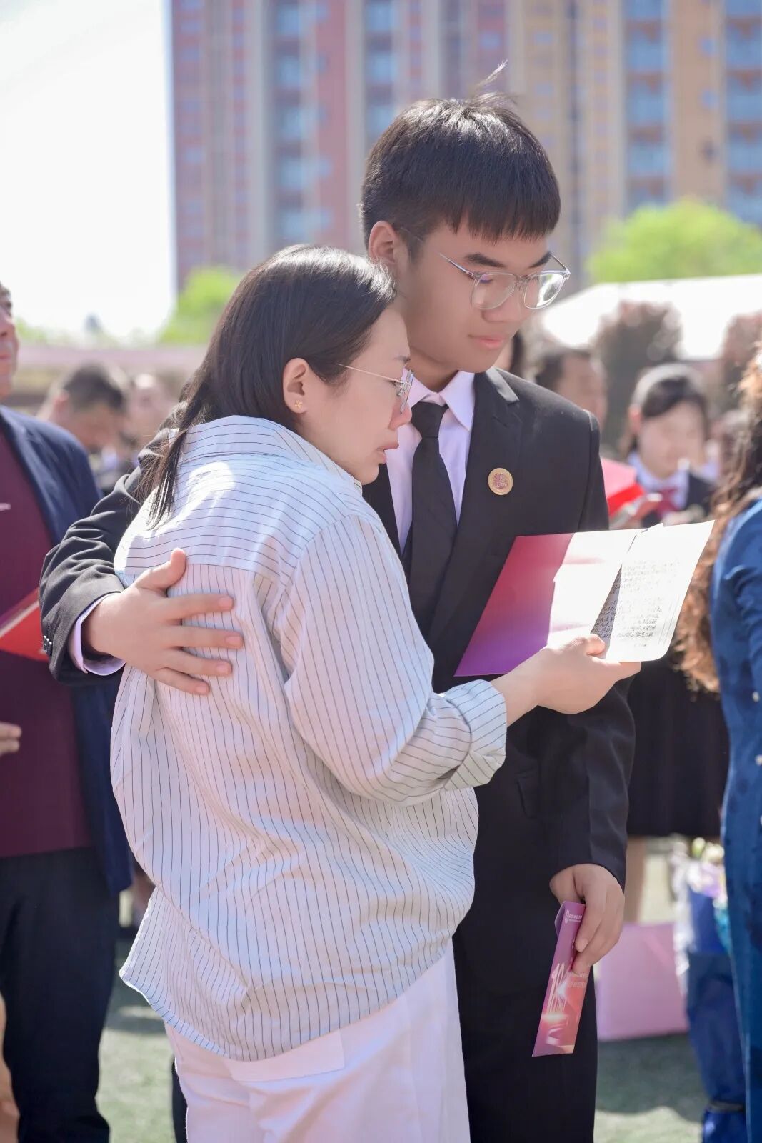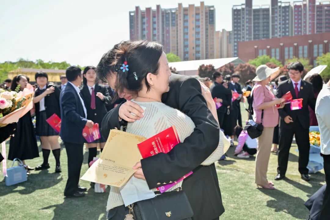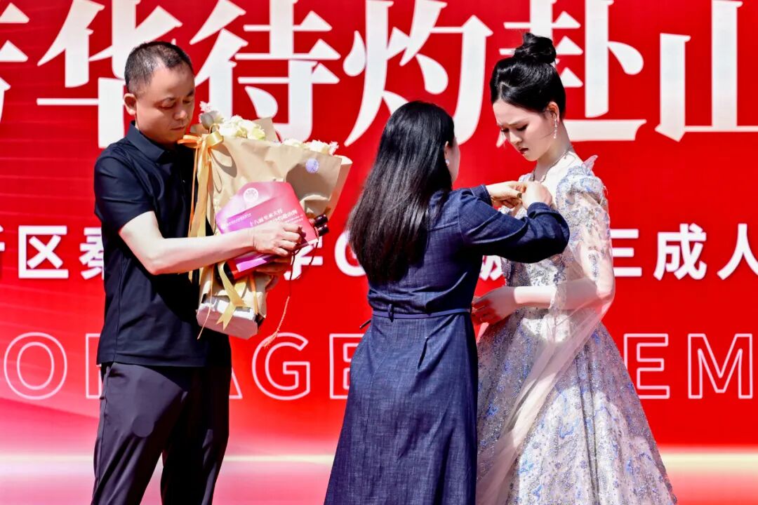 现场温情涌动,家长们有序来到孩子身侧,亲手为孩子佩戴成人纪念徽章、赠送《中华人民共和国宪法》;同学们则将饱含感恩的书信郑重递交父母,共读家书、相拥致意,泪光与微笑交织,纸短情长,道尽十八载相依相伴的深情。