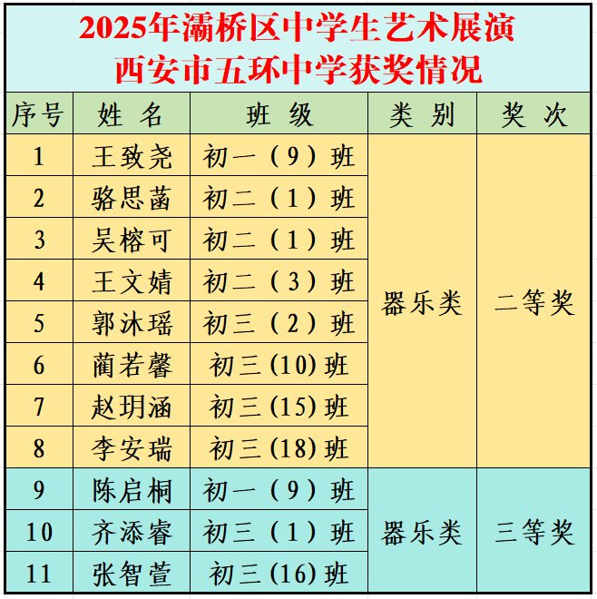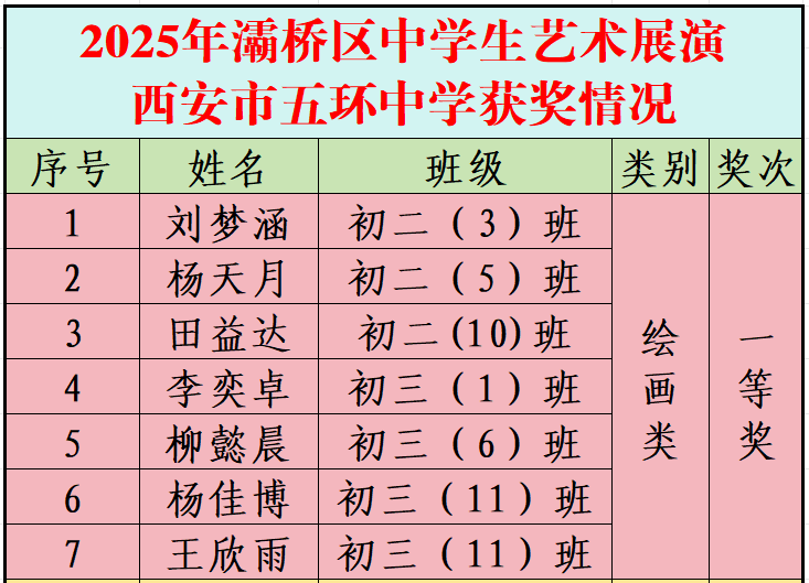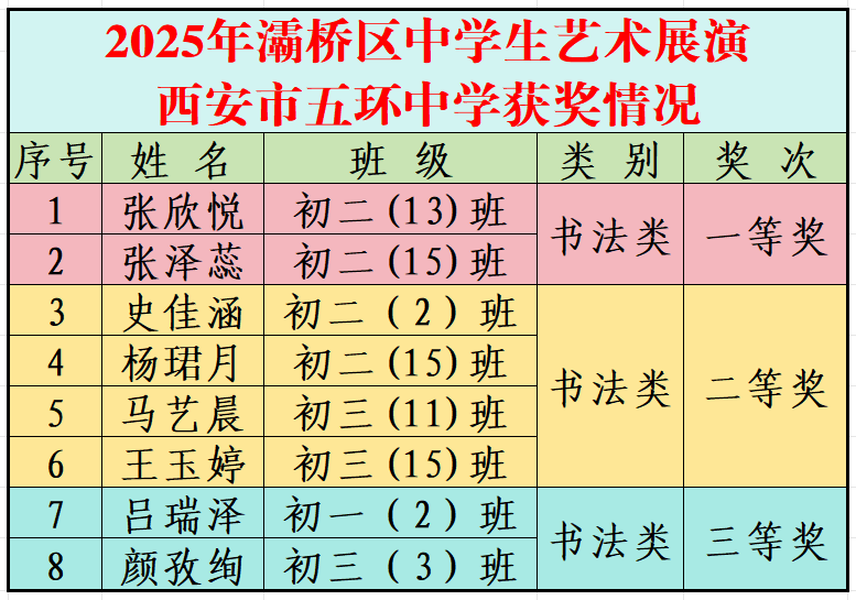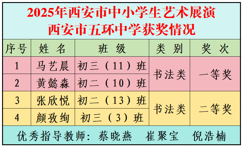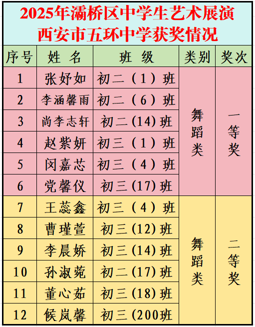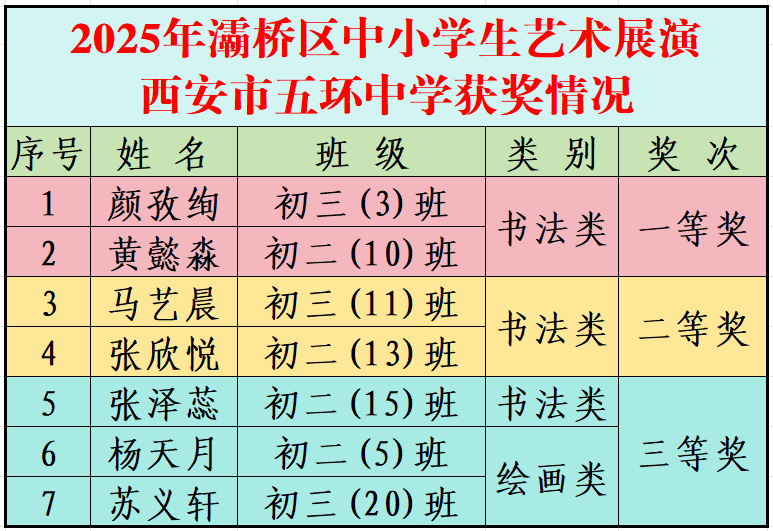 近日,西安市、灞桥区2025年中小学生艺术展演、灞桥区2025年中学生艺术展演三个比赛活动成绩揭晓,西安市五环中学初中学子在这轮比赛中表现突出,82人次获奖。在西安市比赛中,4名学生荣获书法类一、二等奖;在灞桥区比赛中,78人在绘画、书法、舞蹈、声乐、器乐五大类比赛中荣获一、二、三等奖。其中一等奖19人,占比近四分之一,成绩在全区十分亮眼。同时,3名艺术教师荣获西安市“优秀指导教师奖”。