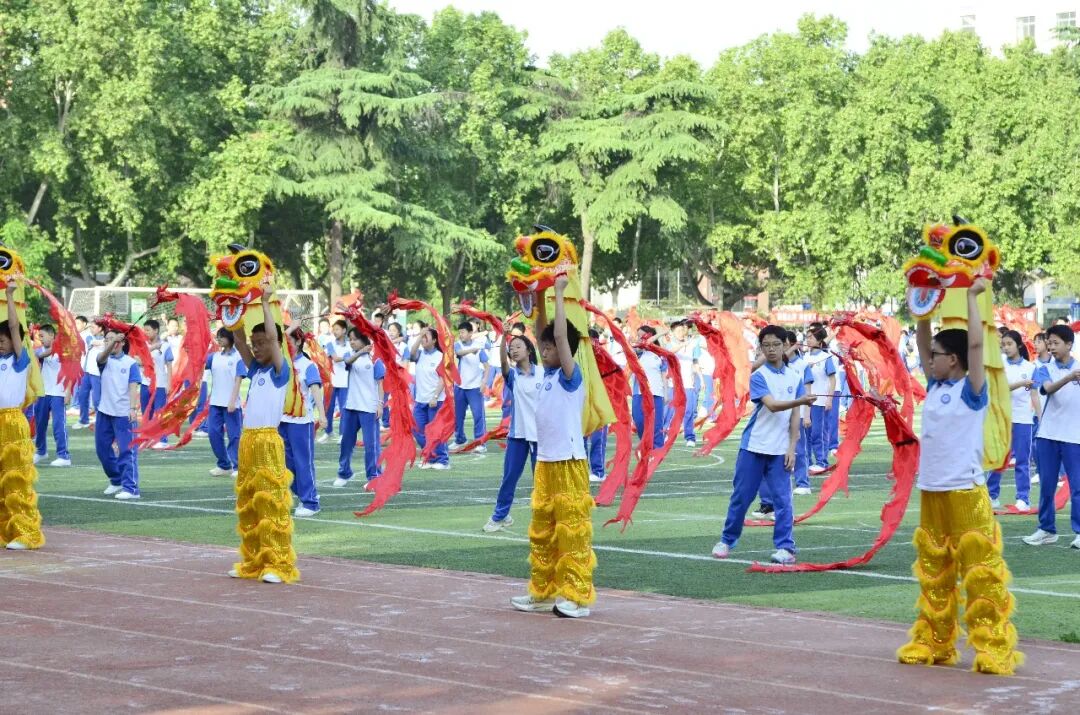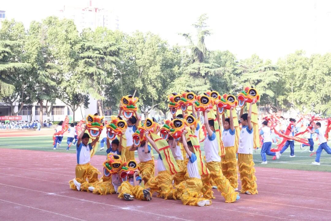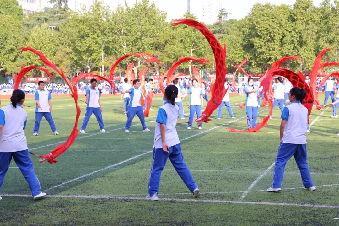 鼓声一变,初一年级的《彩龙舞东方》磅礴登场。少年们化身灵动的彩龙,踏浪而来。每一次转身都充满力量,每一次伸展都洋溢活力,他们在绿茵场上写下了“乘风破浪”四个大字。