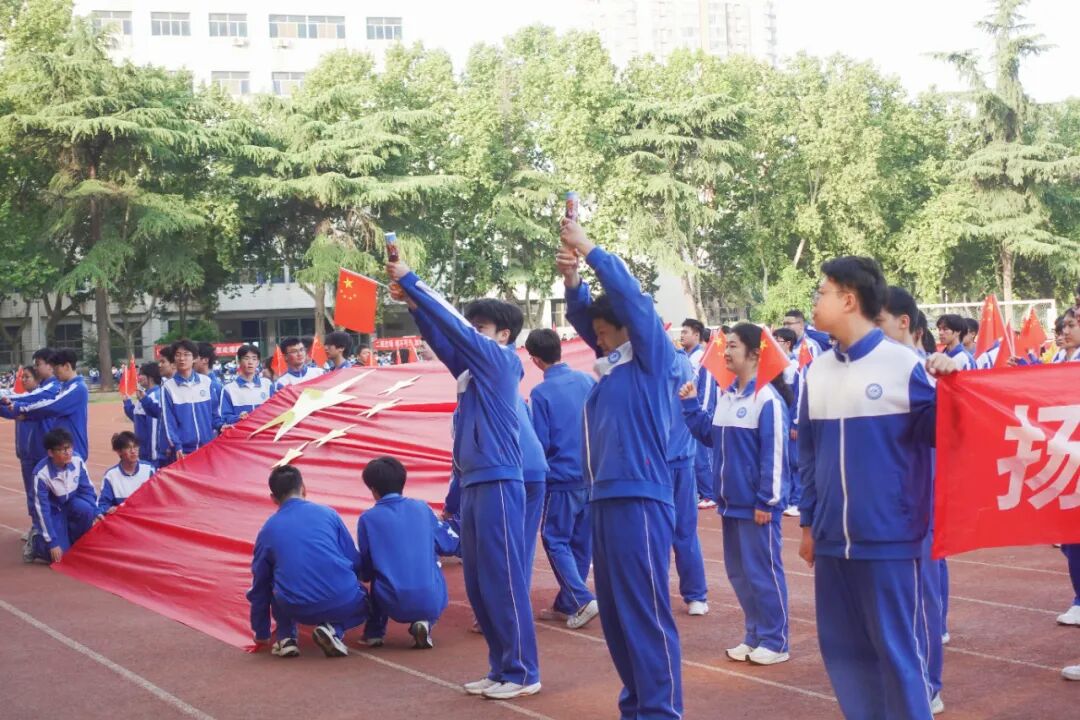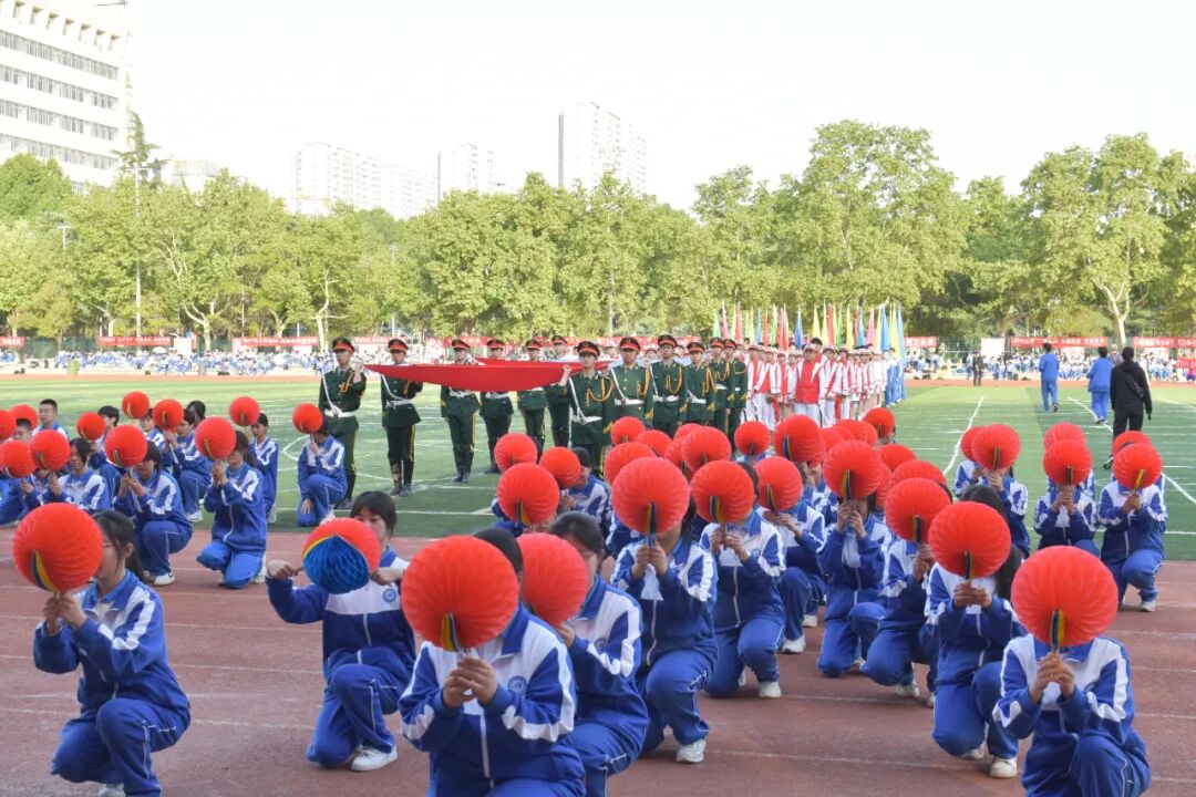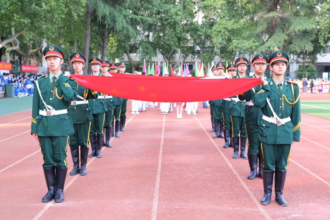 高中部组成的国旗、校旗、会旗方阵打头阵,少年们目光如炬,正步生风,将家国情怀与太白学子的担当踏实地印在红跑道上。