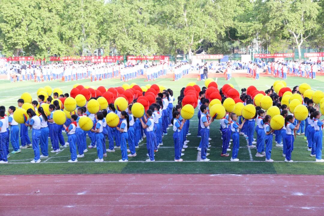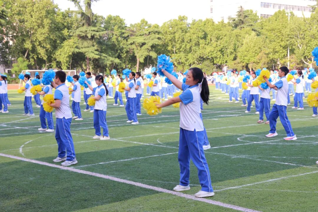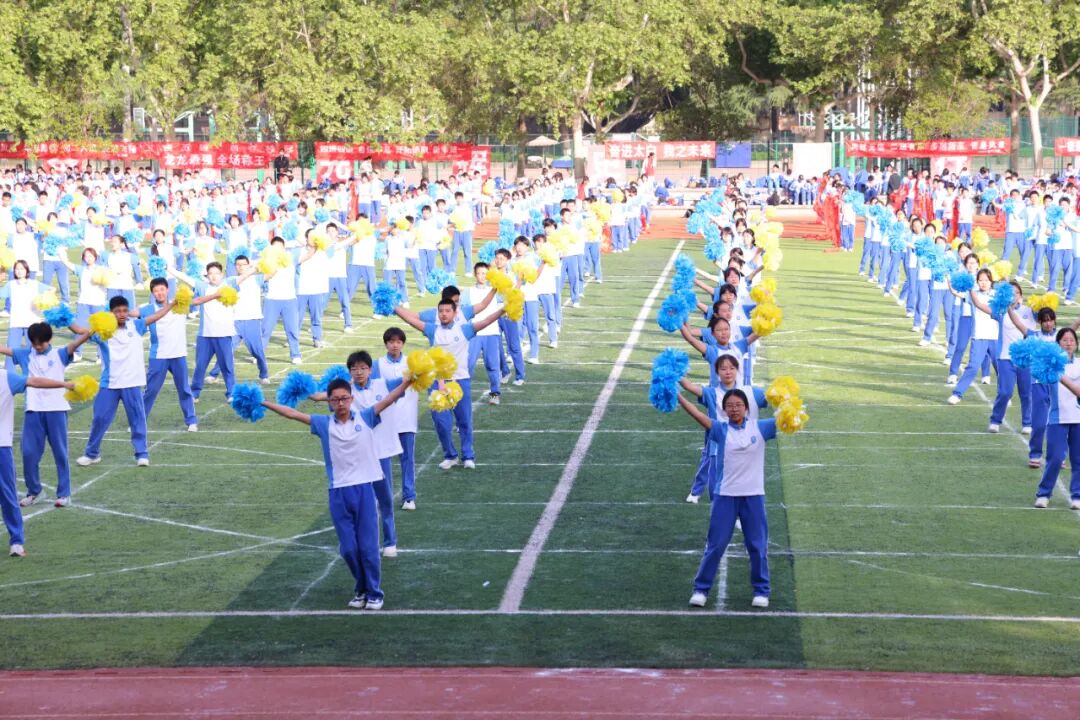 初二年级的《快乐小马》则画风一转,活泼灵动。蓝白校服与黄蓝花球交相辉映,少年们以小马奔腾之姿,舞出了昂扬斗志,诠释了团结奋进。
