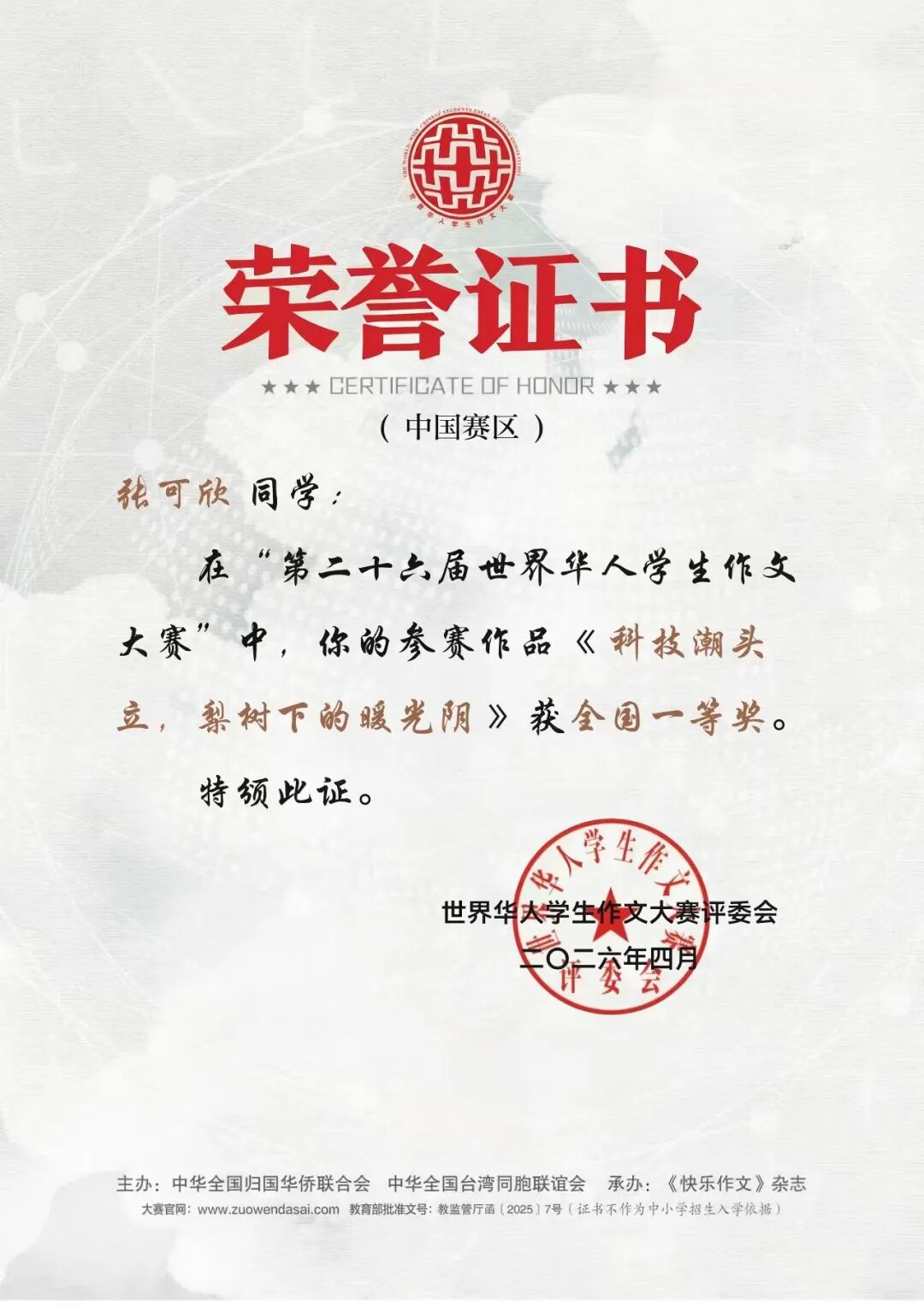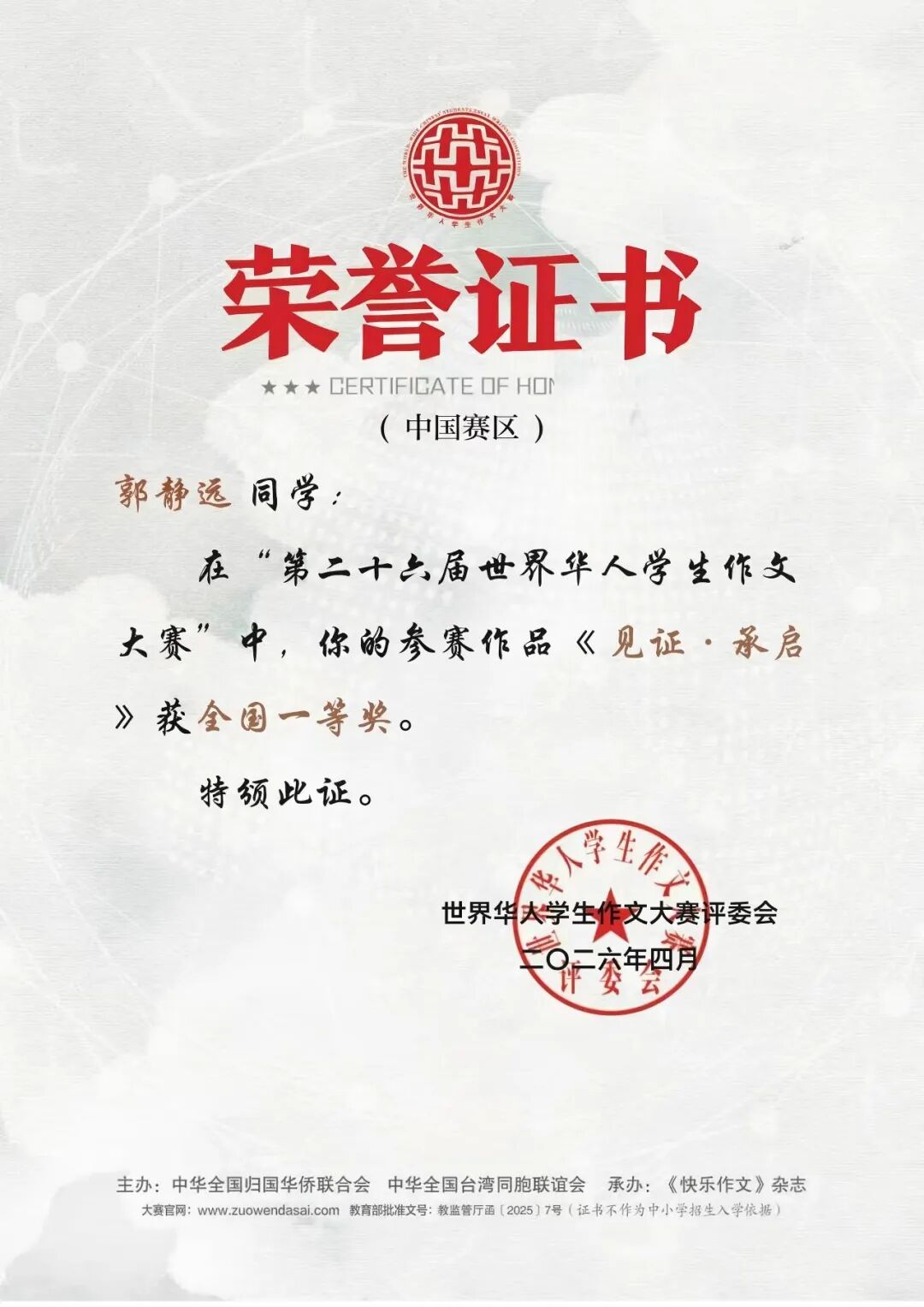 近日,第二十六届世界华人学生作文大赛评选结果揭晓。秦汉中学学子凭借扎实的文学素养、开阔的人文视野与深刻的思想表达,在激烈的竞争中脱颖而出,取得优异成绩。