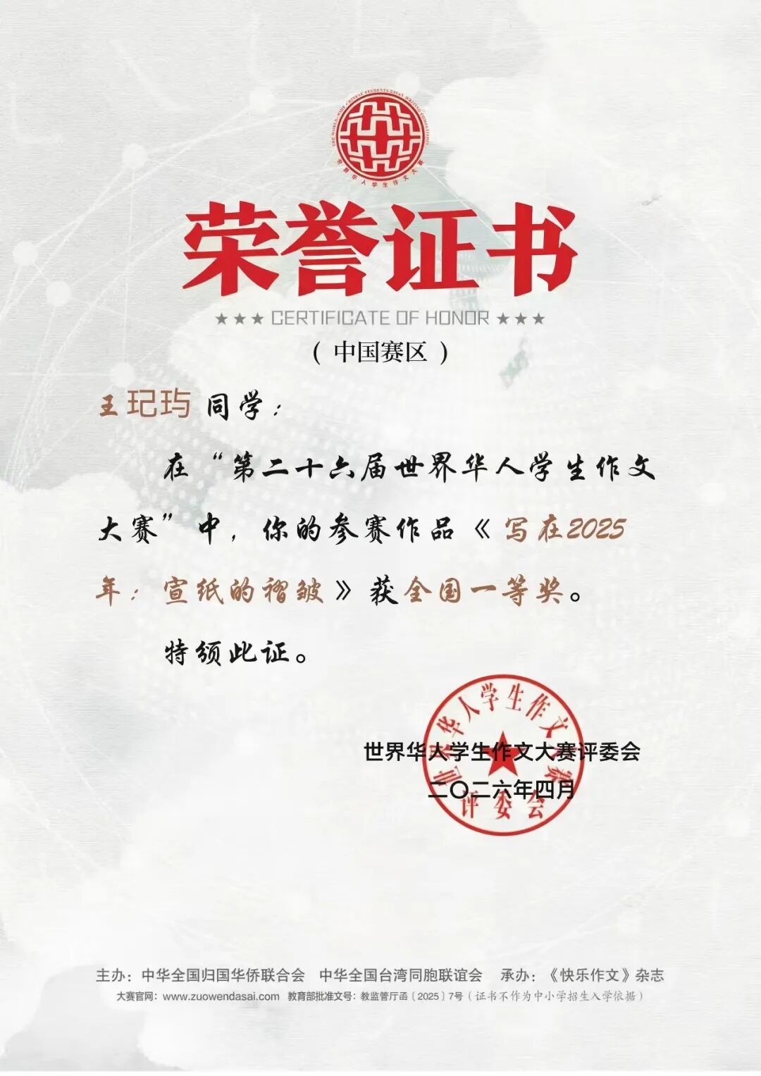 据了解,第二十六届世界华人学生作文大赛经教育部正式批准,由中国侨联与全国台联共同主办。本届大赛覆盖面广、参与度高,共吸引来自73个国家和地区的3880所学校、570余万名学生踊跃参与,复审环节收到稿件超过55万份。在主题设置上,大赛围绕“写在2025年”“无用之用”“数智时代的‘天涯’与‘比邻’”等方向展开,旨在鼓励青少年紧跟时代步伐,深入关注科技变革动态与传统文化传承。