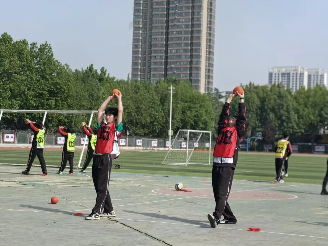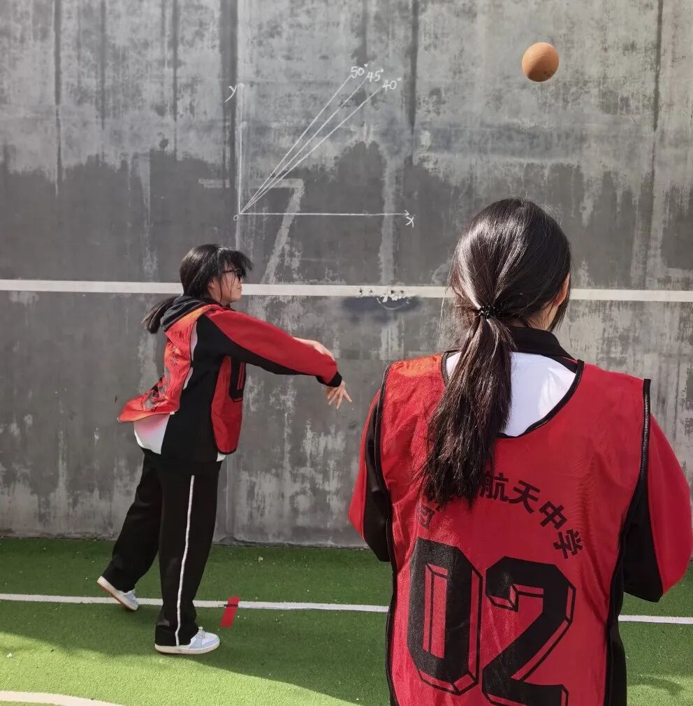 带着疑问,学生们主动探究、合作推导斜抛运动射程计算公式,层层拆解物理原理,最终发现投掷距离与投射角度密切相关,并精准推算出45°为斜抛运动最佳投射角度。理论落地实践,王文喜老师衔接教学内容,结合得出的理论结论,指导学生使用带彩带的专用训练球进行实操投掷。借助彩带直观观察运动轨迹与投射角度,引导学生主动调整姿势,不断贴近45°最佳投掷角度。